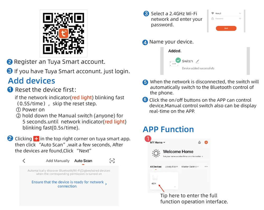 【APP пульт дистанционного управленияВы можете управлять подключенным бытовым прибором в Tuya или smart life APP в любом месте и в любое время. Например, светильник, электрический чайник, электрическая рисоварка, электрический занавес и т. д.【 RF433 управление】Модуль WIFI поддерживает частоту RF433, и вы можете управлять модулем WIFI с помощью пульта дистанционного управления RF433mhz.【Управление для мобильного телефонаКогда вы выходите на улицу или дома, вы можете управлять устройством в вашем смартфоне с помощью 2G/3G/4G мобильной сети или WIFI.(Примечание: роутер должен быть в сети. Wi-Fi модуль должен поддерживать близкое расстояние с маршрутизатором и WIFI модуль должен онлайн в приложении Tuya Smart Life)【Голосовое управление 】Совместим с Alexa и Google Assistant, вы можете использовать Голосовое управление для включения/выключения подключенных бытовых приборов.【Share Control】Одно устройство может управлять несколькими телефонами, вы можете поделиться модулем Wi-Fi с вашей семьей.【Групповое управлениеОдин телефон может управлять несколькими смарт-устройствами. Вы можете добавить модуль wifi и другие смарт-устройства в группу, а затем вы можете включить/выключить все смарт-устройства одновременно.