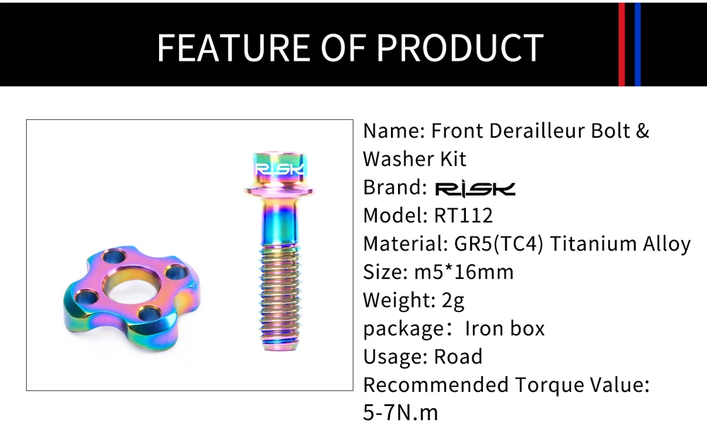 Risk дорожный велосипед передний переключатель крепежный винт шайба комплект M5 * 16 полый дизайн Superlight TC4 крепежные болты изогнутая прокладка бренд: RISKПродукт: дорожный велосипед передний переключатель TC4 титановый сплав фиксированные болты и шайбаМатериал: титановый сплав TC4Цвет: Золотой Черный РадужныйУпаковка: 1 комплект * велосипед фиксированные болты