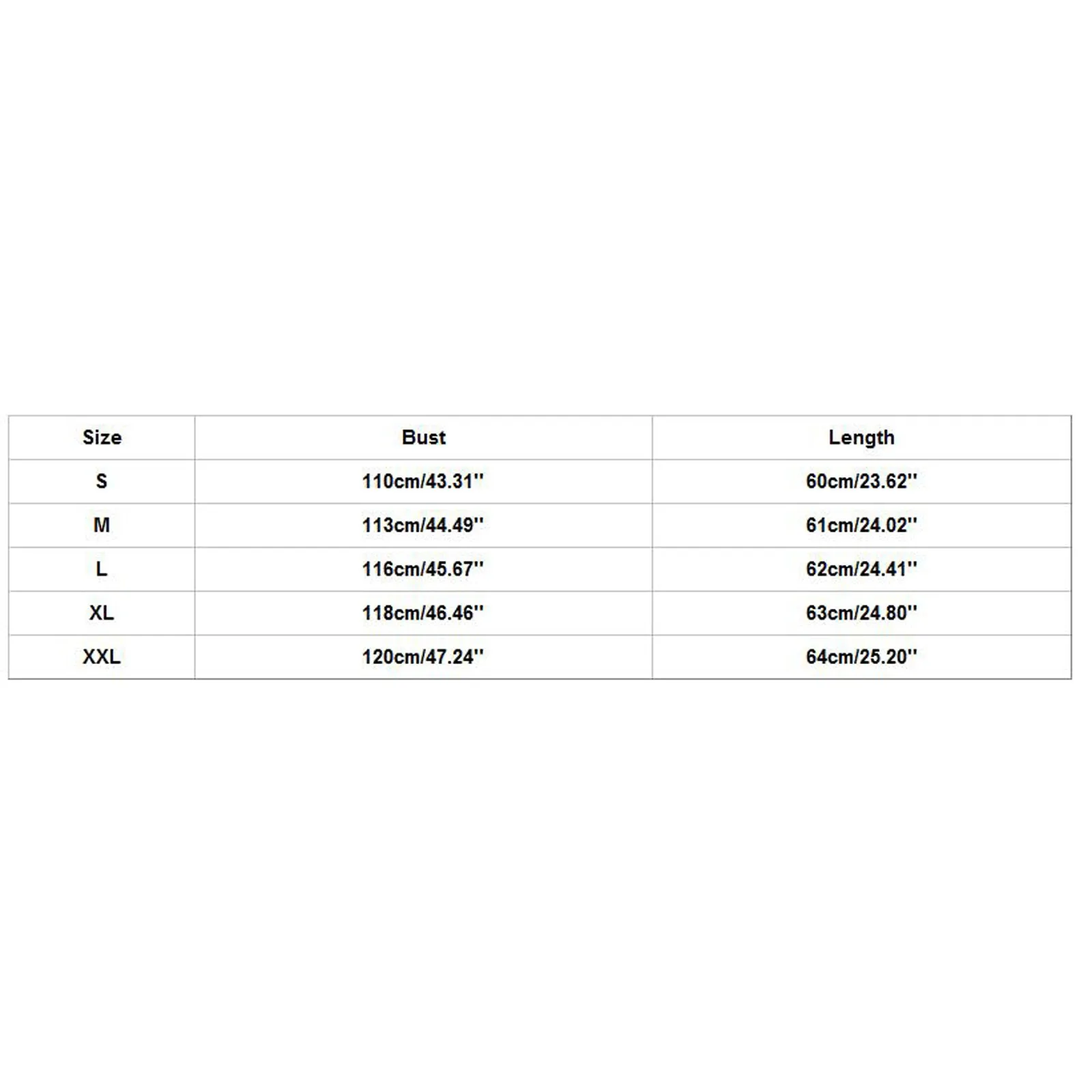 Размер: S Обхват груди: 110 см/43,31 дюйма Длина: 60 см/23,62'' Размер: M Обхват груди: 113 см/44,49 дюйма Длина: 61 см/24,02'' Размер: L Обхват груди: 116 см/45,67 дюйма Длина: 62 см/24,41'' Размер: XL Обхват груди: 118 см/46,46 дюйма Длина: 63 см/24,80'' Размер: XXL Обхват груди: 120 см/47,24 дюйма