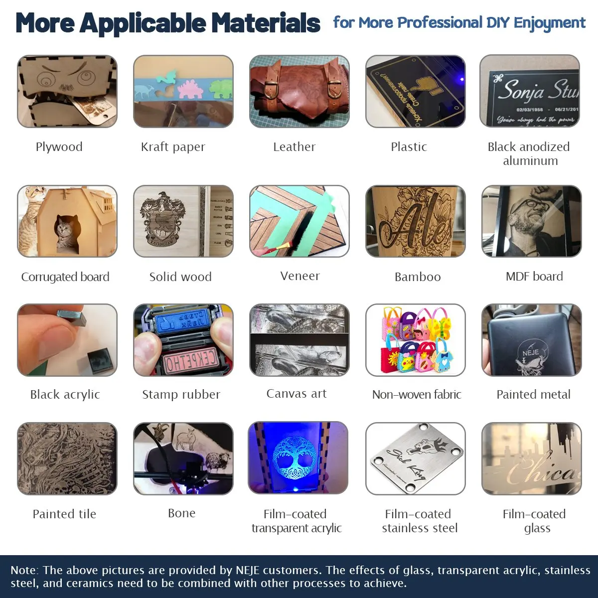 Доступные материалы гравировки: дерево, картон, акрил, металлДоступные материалы для резки: крафт-бумага, картонная коробка и т. Д.