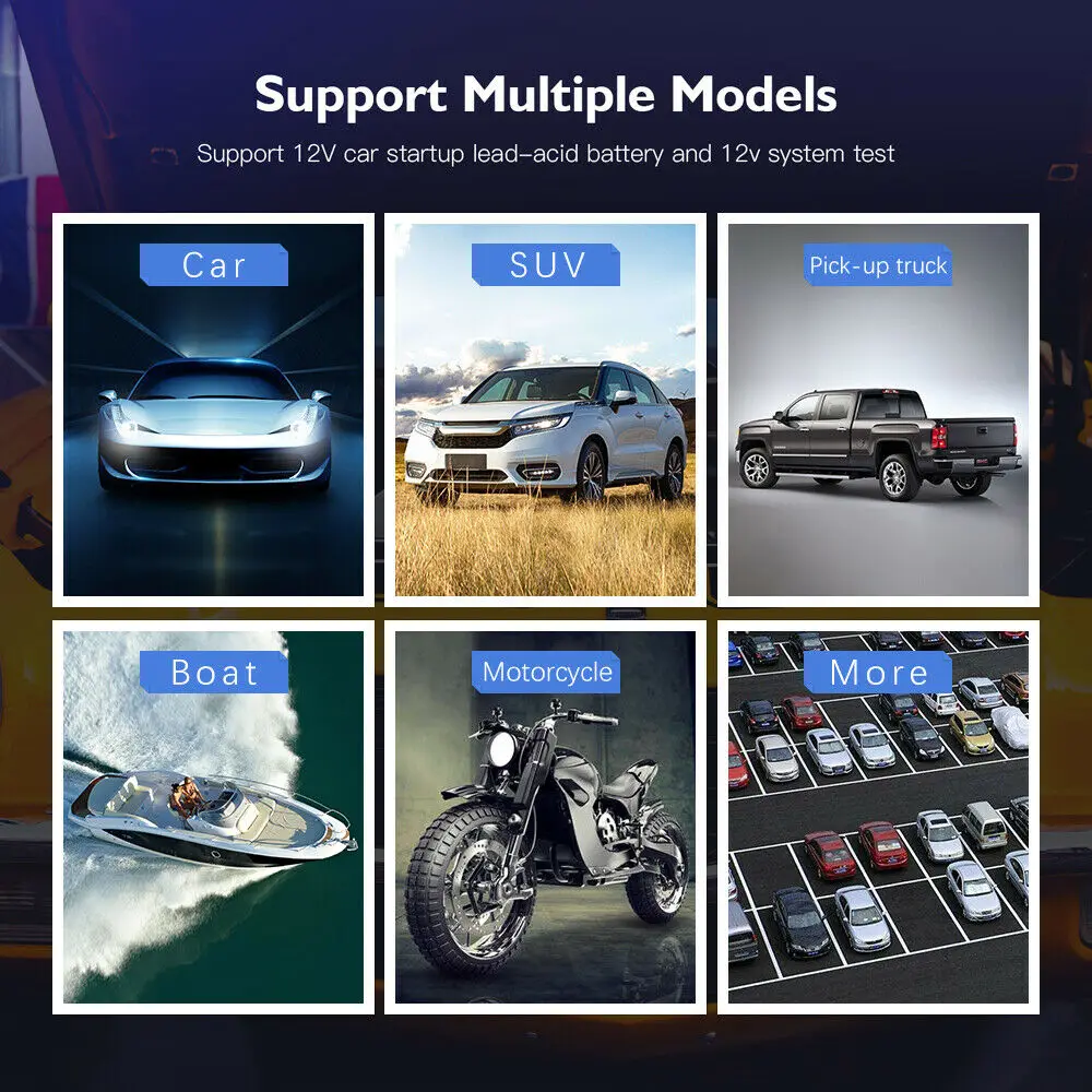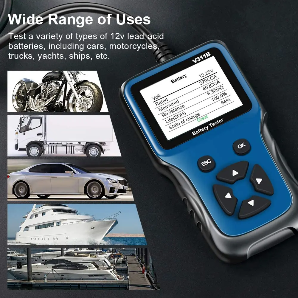 Может ли он работать в вашем автомобиле? Тестер Аккумуляторов может работать на свинцово-кислотных аккумуляторах 12в100-2000cca, включая Обычные аккумуляторы, плоские панели AGM, спирали AGM, батареи GEL и EFB, и совместим с автомобилями, кораблями, мотоциклами, грузовиками, яхты и т. д.