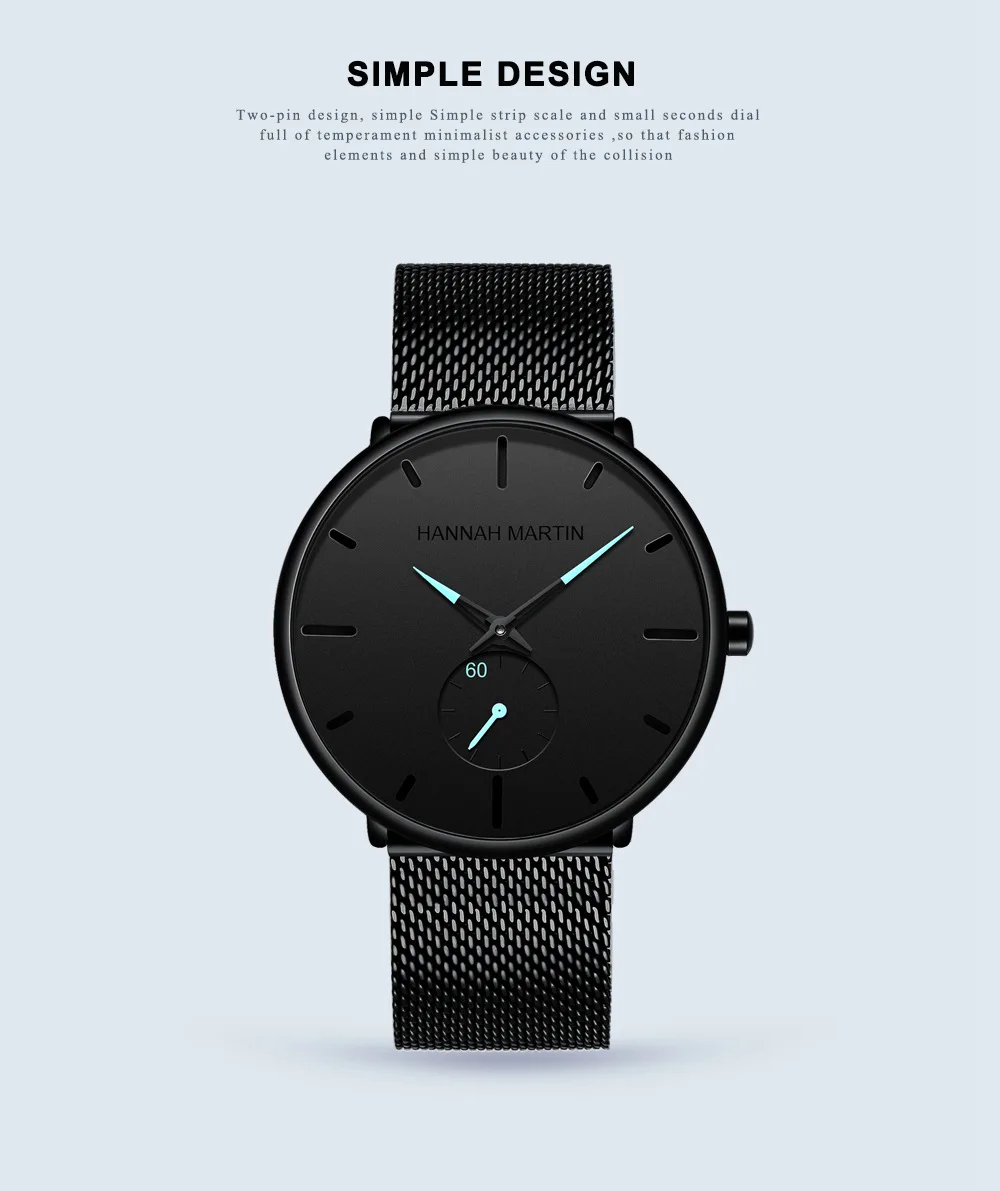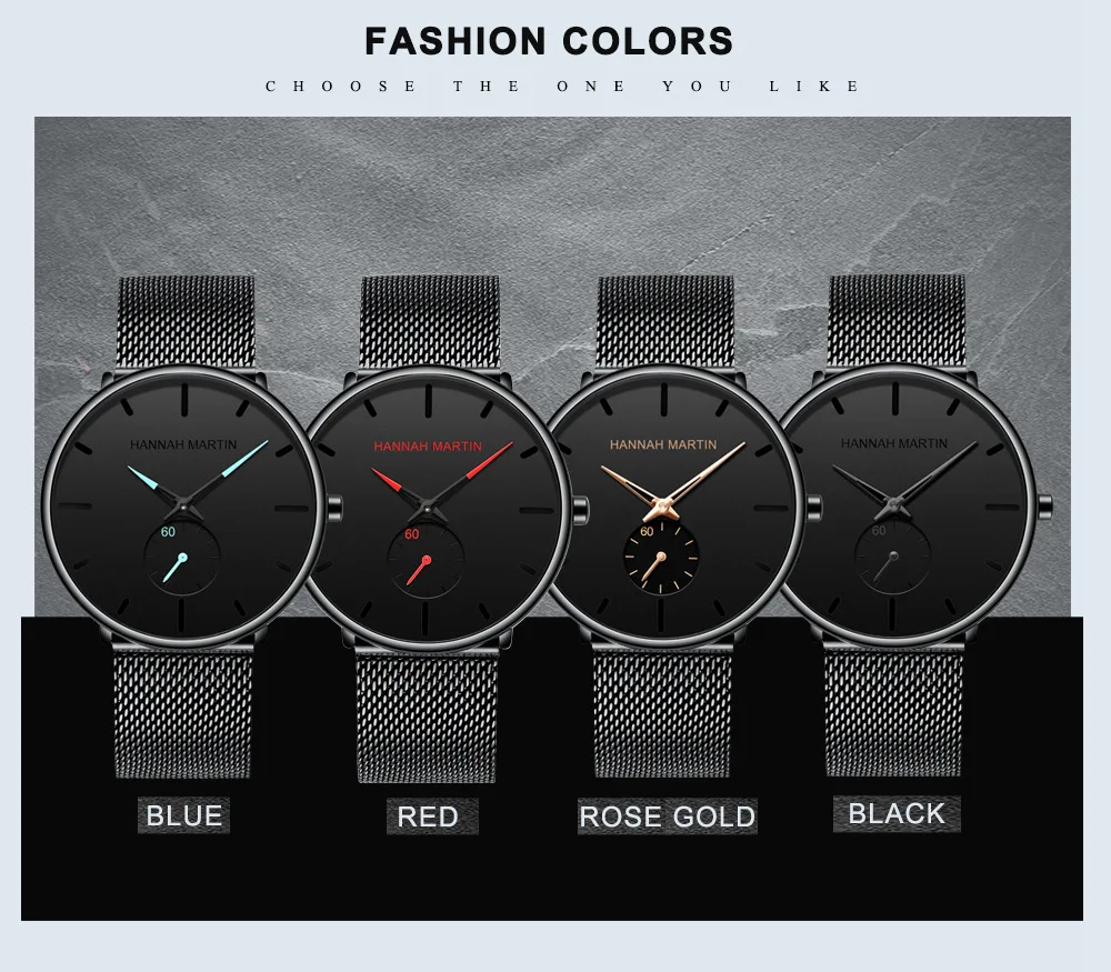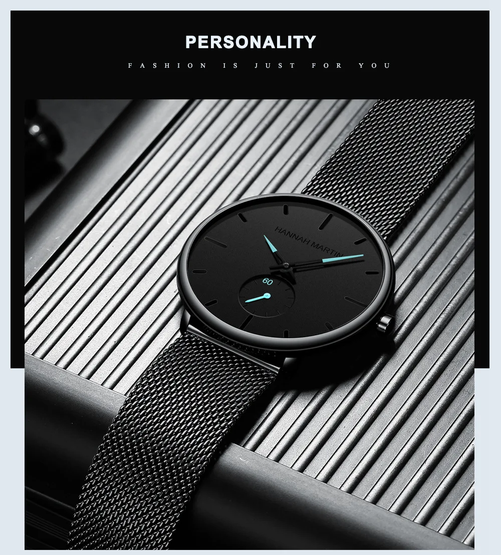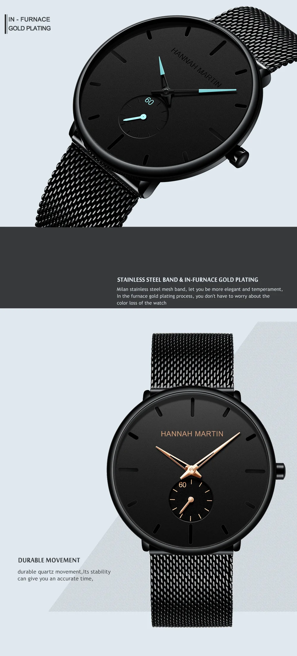 Hannah Martin HM-100G, модные, простые, дизайнерские, водонепроницаемые, нержавеющая сталь, сетка, маленький циферблат, мужские часы, мужские кварцевые наручные часы