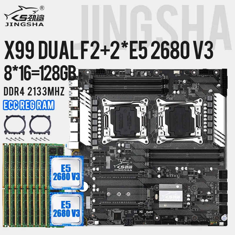 JINGSHA X99 dual F2 CPU motherboard Комплект материнская плата набор пк с Intel Xeon E5 2680 V3, двойной ЦПУ + 8 * DDR4 16 Гб 2133MH ECC REG, комбинированная Серверная материнская плата
