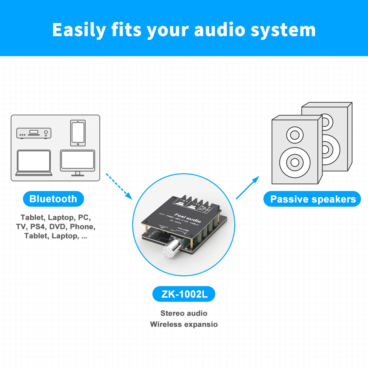 【Mini но Power ful】 2 CH стерео выходная мощность 100 ватт * 2, диапазон рабочего напряжения DC5-24V, для пассивных динамиков 4-8 Ω, 50 Ватт-300 Ватт.