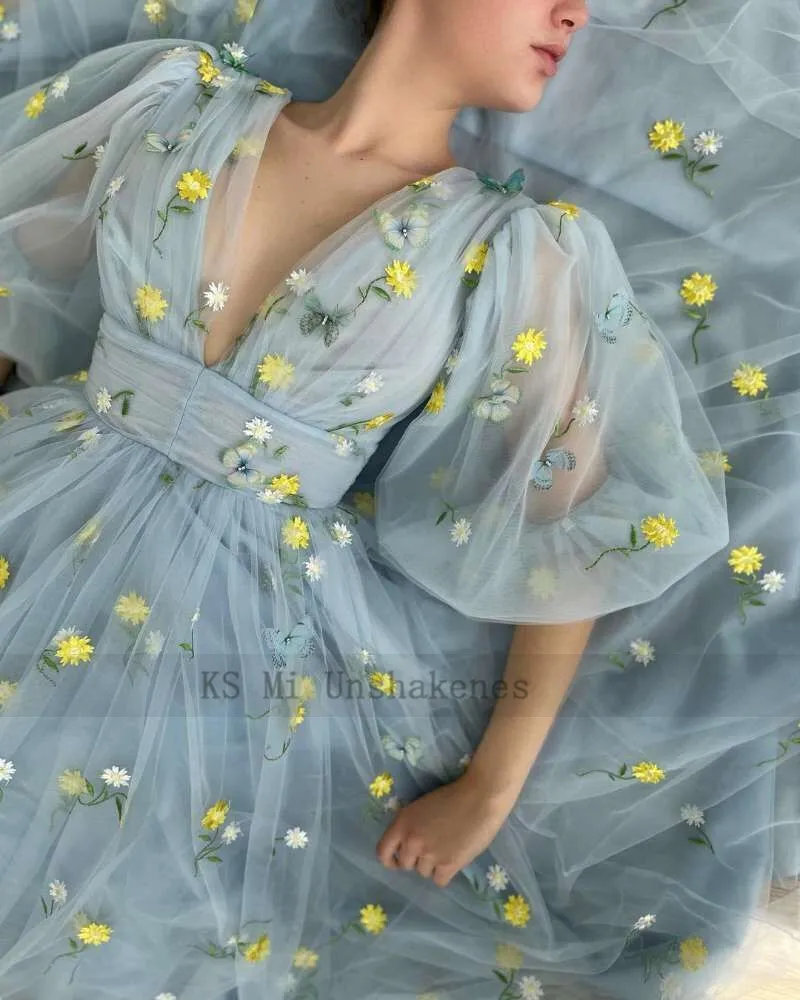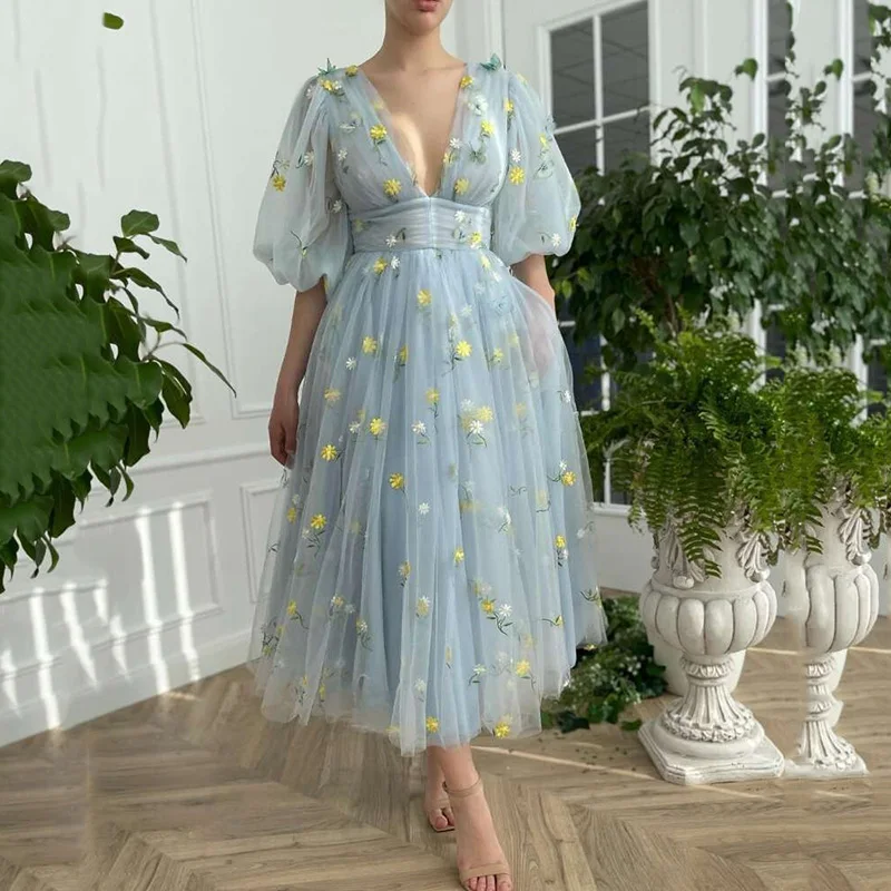 Соблазнительные платья длиной ниже колена для выпускного вечера, кружевное вечернее платье с пышными рукавами для встречи выпускников, желтые женские Формальные Вечерние платья с вышивкой