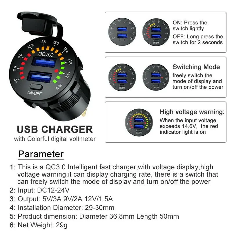 Описание:1: Это Интеллектуальное Быстрое зарядное устройство QC3.0 с дисплеем напряжения, предупреждением о высоком напряжении, оно может отображать скорость зарядки, есть переключатель, который может свободно Переключить режим отображения и включить/выключить питание.2: слегка нажмите переключатель, чтобы включить питание, он может отображать напряжение в режиме реального времени после того, как полноэкранный индикатор загорится в течение 2 секунд, И затем нажмите кнопку еще раз, чтобы переключиться на красный индикатор питания. Оба режима дисплея могут быть свободно переключены кнопкой, нажмите и удерживайте переключатель в течение двух секунд, чтобы выключить питание устройства. После выключения питания это означает, что устройство отключило вход питания, а затем достигло эффекта экономии электроэнергии.3: в тех случаях, когда напряжение на входе превышает 14,6 V, красный индикатор светильник включен (функция предупреждения, это означает, что входное напряжение слишком высока)4: когда питание включено и USB зарядка выполняется, поток цветного экрана указывает на то, что он заряжается; он будет отражать скорость зарядки в зависимости от скорости потока цветного экрана. Когда мобильный телефон полностью заряжен, он будет светильник на весь экран. Через две минуты он снова отобразит напряжение в реальном времени. Режим отображения может быть переключен на отдельный красный светильник индикатора, нажав на выключатель светильник ly. Нажмите и удерживайте переключатель в течение двух секунд, чтобы выключить питание устройства.5. Многоцелевые: питание для мобильных телефонов, планшетных ПК, GPS и других usb-устройств, широкое применение: автомобили, мотоциклы, квадроциклы, внедорожники, UTVs, лодки и т. Д.Характеристики:Есть три типа зарядного устройства на выбор, пожалуйста, выберите модель, которая вам нравится!Модель 1: QC 3,0 Автомобильное двойное зарядное устройство USB с светодиодный выключателем вольтметраМодель 2: 5В/4.8A автомобиля с двумя портами USB Зарядное устройство с светодиодный вольтметр вкл/выкл переключательМодель 3: QC 3,0 + PD автомобильное USB зарядное устройство с светодиодный вольтметр на выключенном выключателеМатериал изделия: АБС-пластикЦвет изделия: черныйВходное напряжение: 12-24 В постоянного токаВыход USB 1: 5 В/3 А постоянного тока; 9 В/2 А; 12 В/1,5 АВыход USB 2: 5 В/3 А постоянного тока; 9 В/2 А; 12 В/1,5 АРазмер: 50х36,8 ммПосылка включает в себя:1 х Автомобильное USB зарядное устройство с светодиодный вольтметр на выключенном выключателе