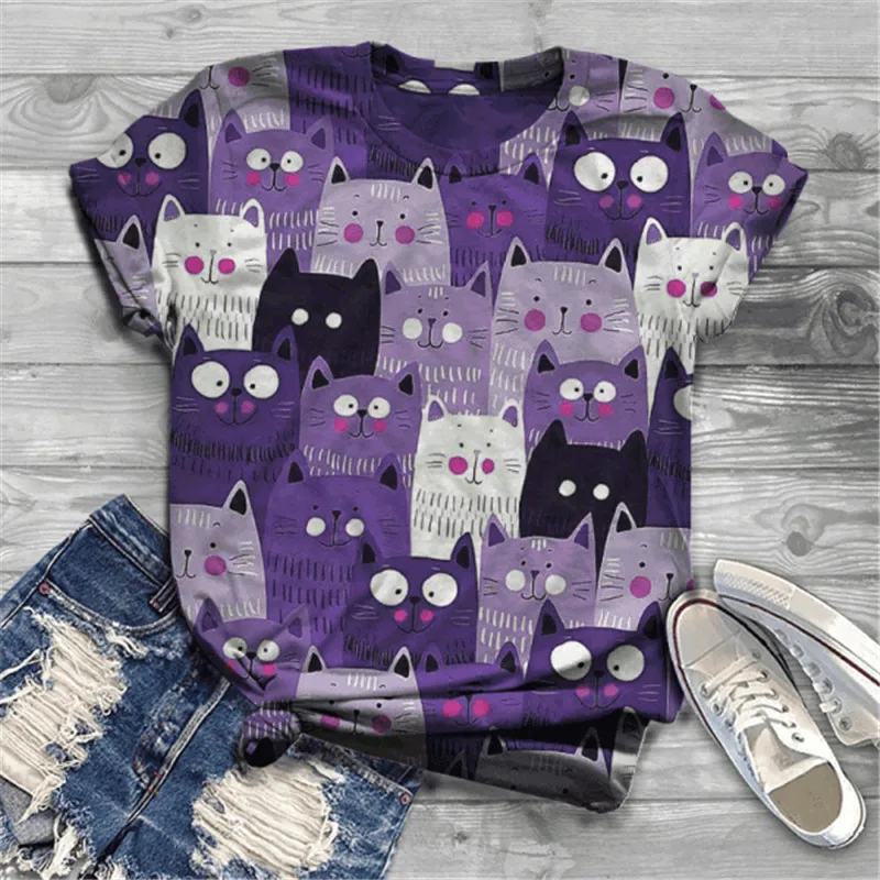 Футболка женская с коротким рукавом, круглым вырезом и рисунком кот...