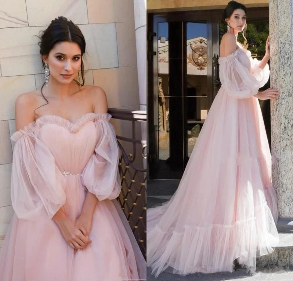 Женское вечернее платье с открытыми плечами, розовое длинное праздничное платье-трапеция с длинным рукавом, платье для выпускного вечера, 2022