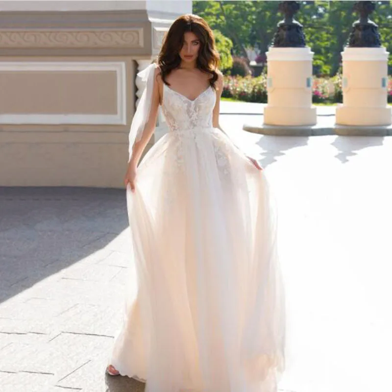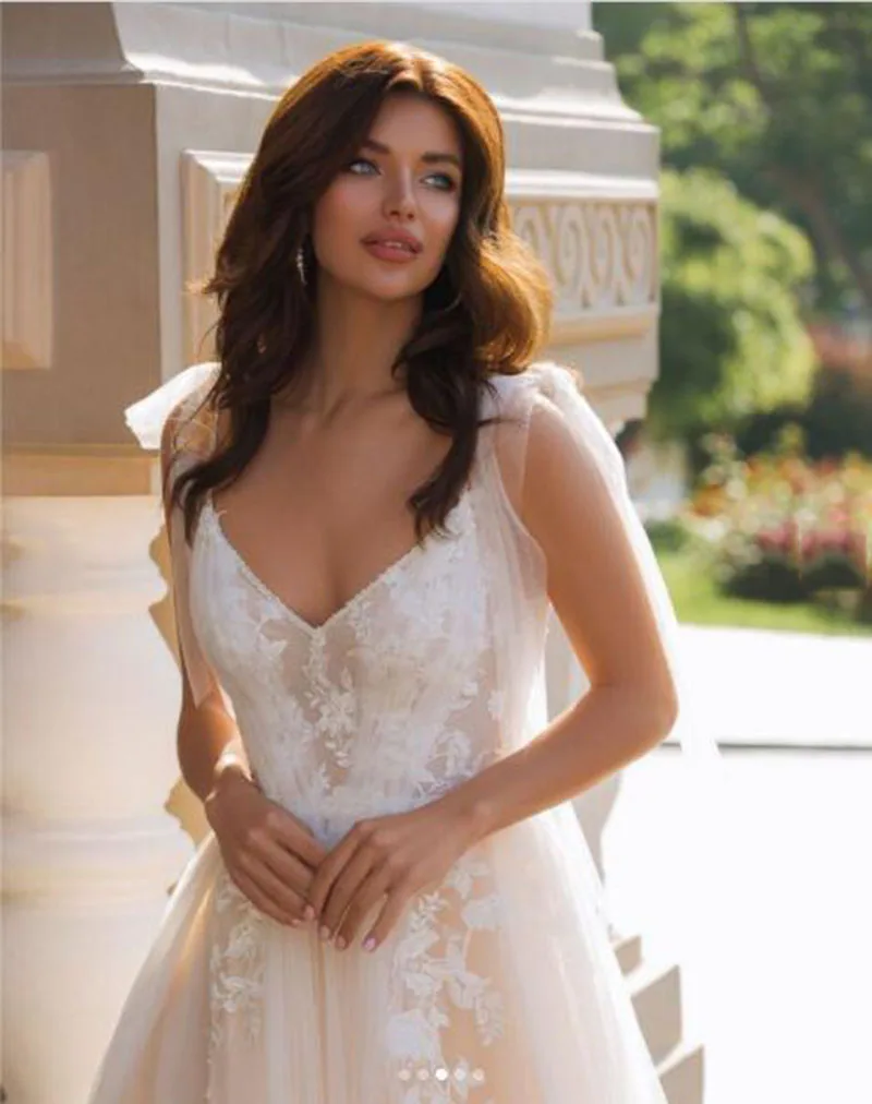 Женское кружевное свадебное платье с V-образным вырезом и аппликацией