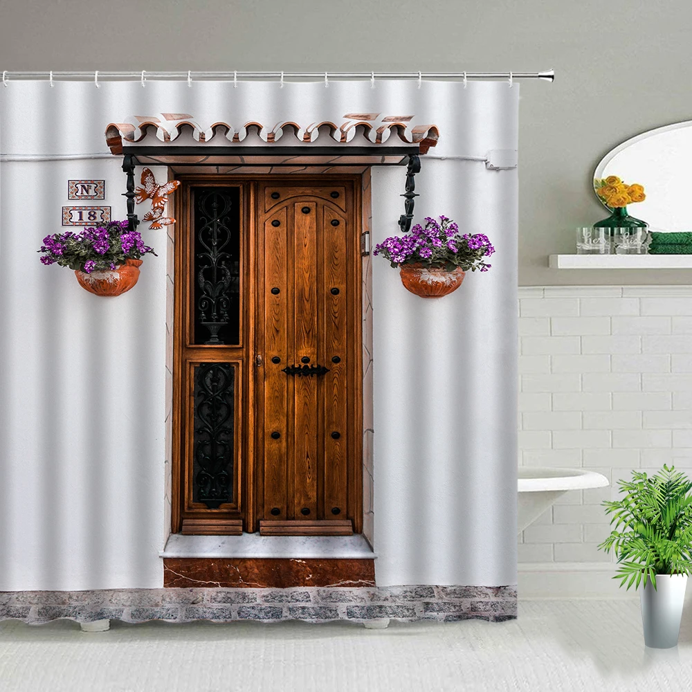 Занавеска для душа, с принтом в виде деревянной двери, водонепроницаемая, с крючком