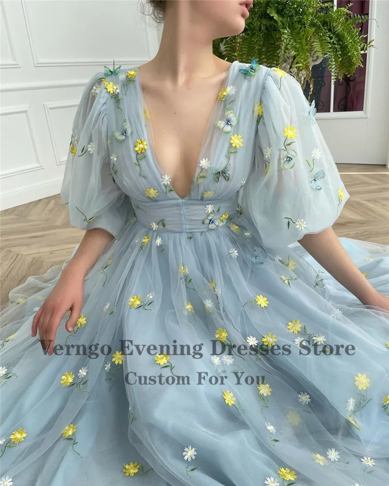 Платье женское из тюля, с пышными рукавами, V-образным вырезом и цветочным принтом, светло-голубосветильник, для выпускного вечера, Verngo, 2021