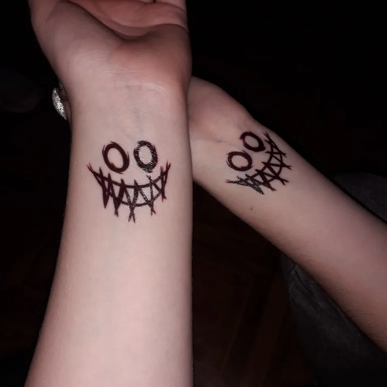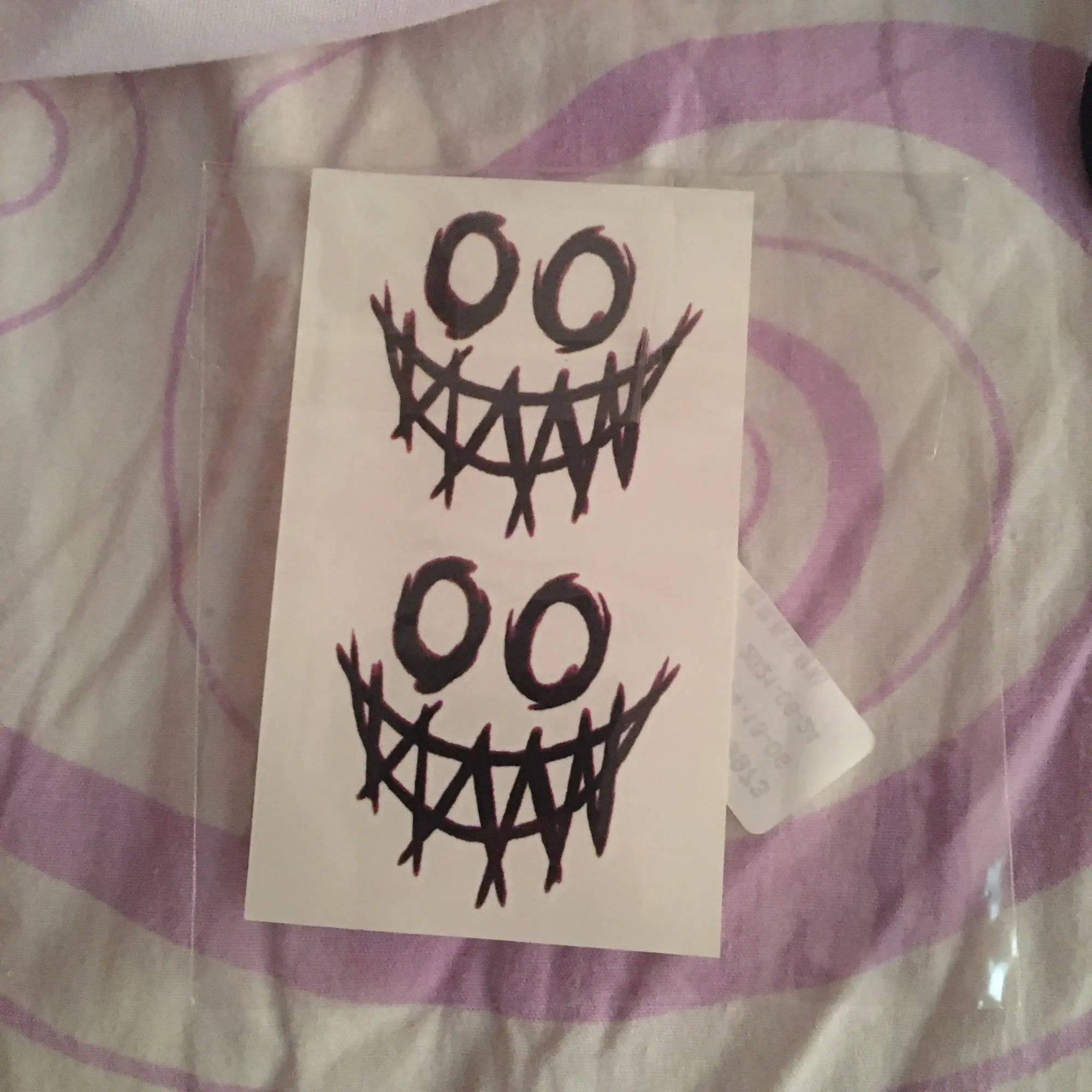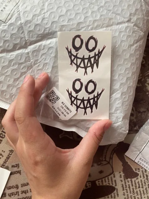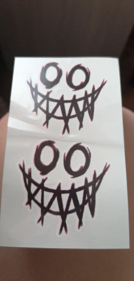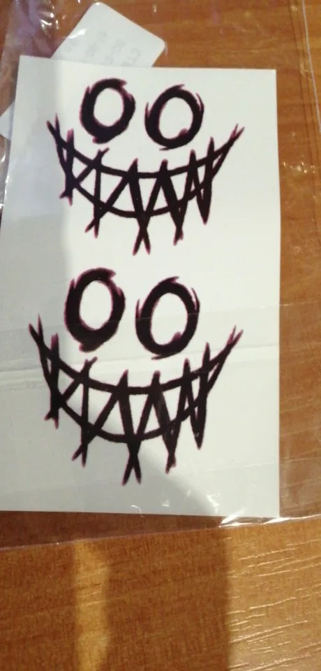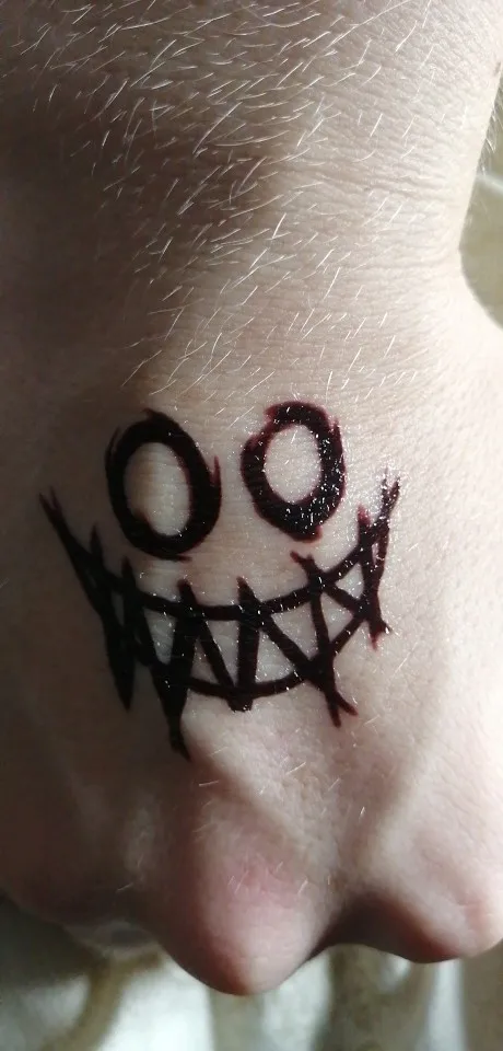 Топ за 28 рублей, но нужно уметь её клеить. Наклеил на руки. В итоге на левой руке только улыбка, потому что один глаз просто сложился в одну толстую линию, на правой более менее нормально наклеилась. Довольно маленькие, на кисть смог бы две штуки наклеить. А я обычный парень по габаритам.