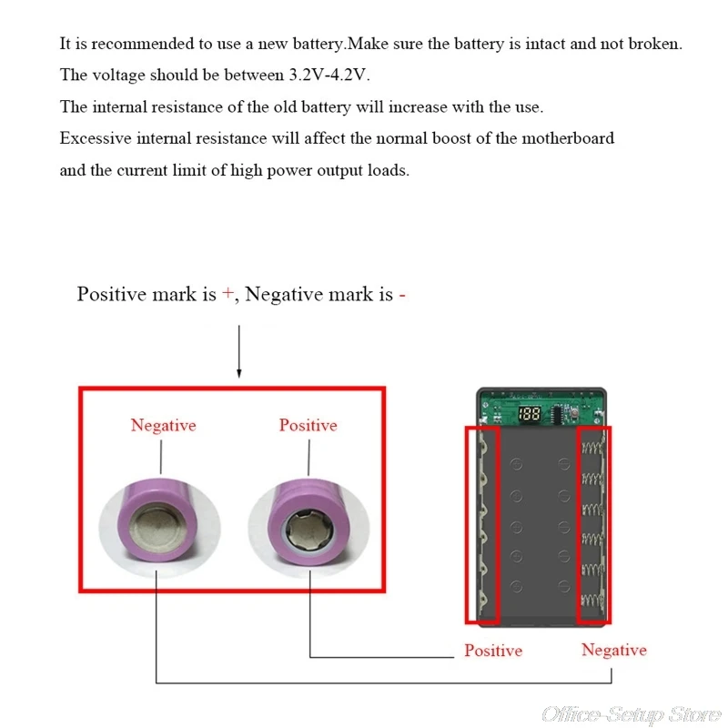 Советы:18650 батареи не включены в посылка, вы должны приобрести отдельно.Можно использовать только батарею 18650, положительным электродом которой является плоский верх.Пожалуйста, обратите внимание на направление положительных и отрицательных полюсов.Не закрывайте крышку до тех пор, пока тест не завершится, ее нельзя открыть снова, если она закрыта.