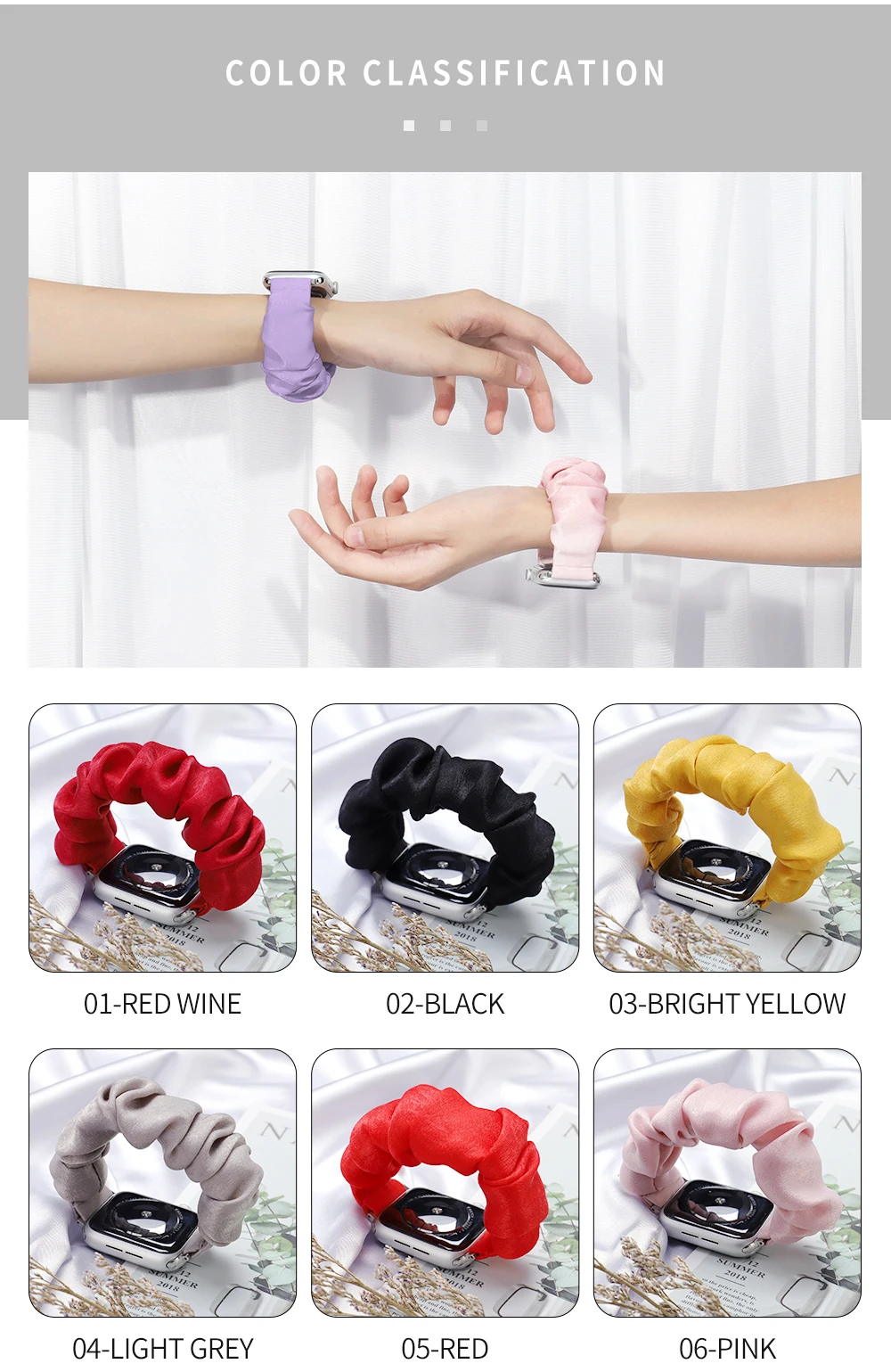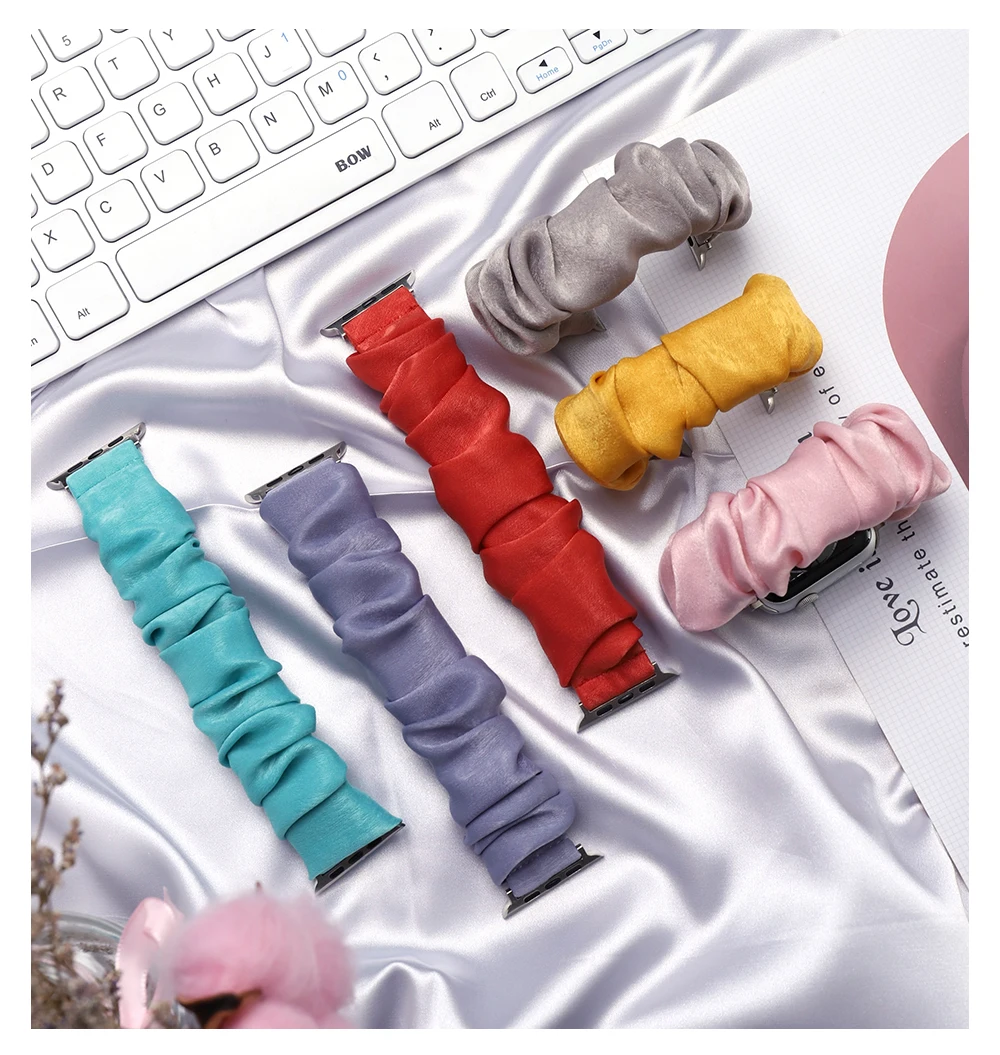 Высококачественный эластичный ремешок из шелкопряда, удобный и дышащий. Доступны разные цвета и размеры. Поверхность шелкопряда нежная и шелковистая. Он чувствует себя деликатным и гладким и удобным в носке и имеет красивый внешний вид. Он очень подходит для женщин и совместим с Apple Watch 1-6 серий.