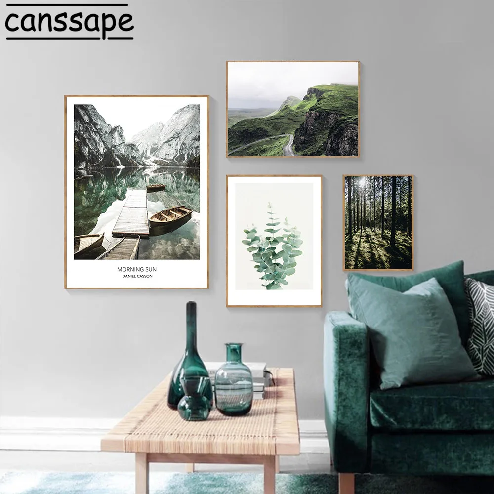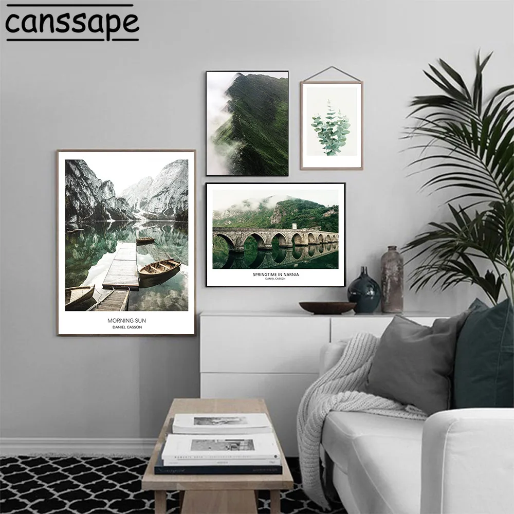 Природа зеленый ландшафт Холст плакат лес солнечный свет стены принт моста картина с изображением лодки Nordic стены Картины для Декор в гостиную