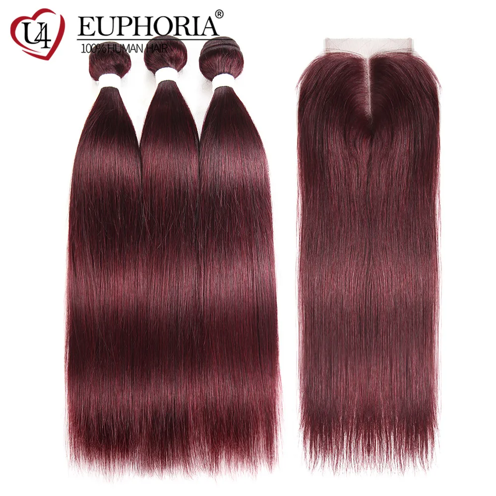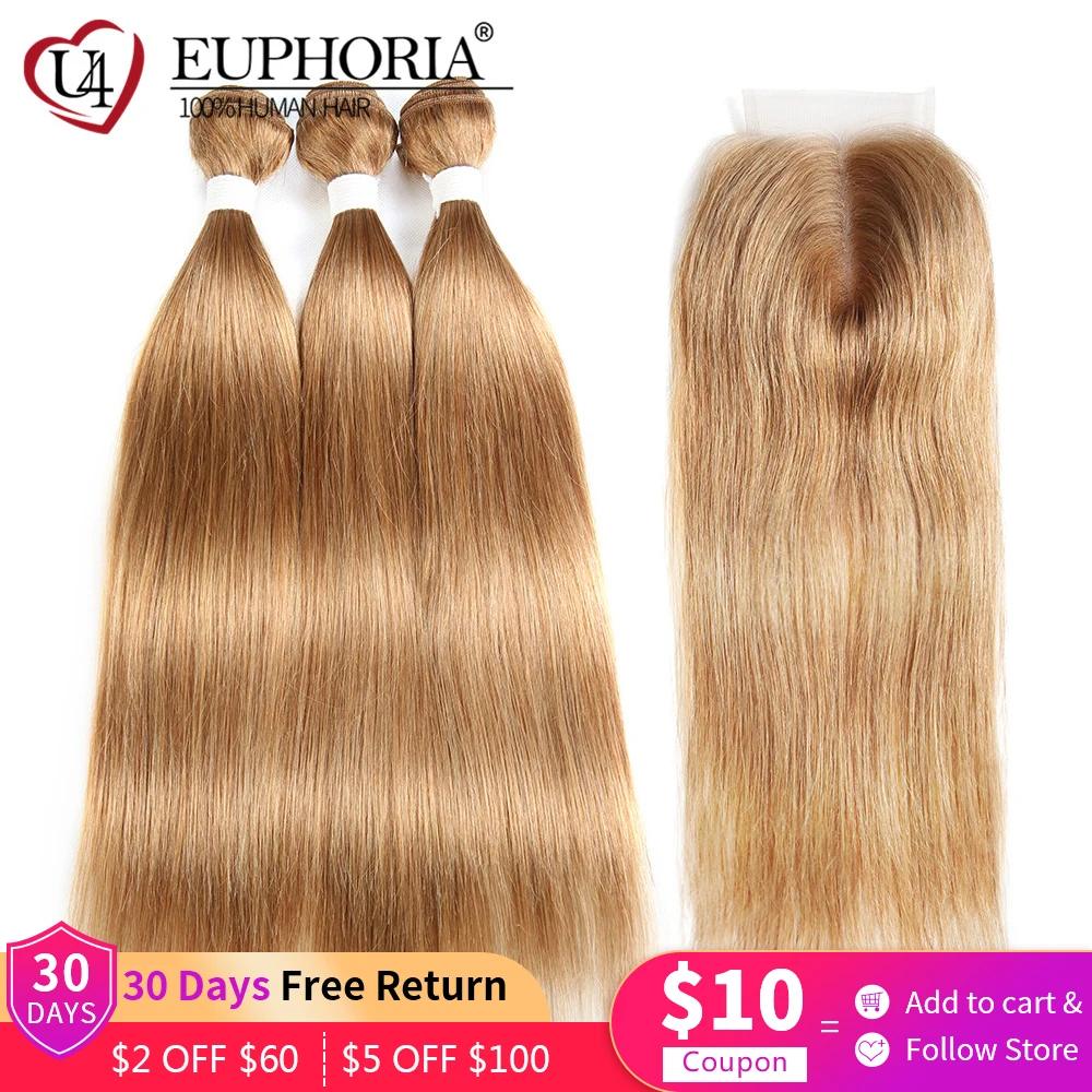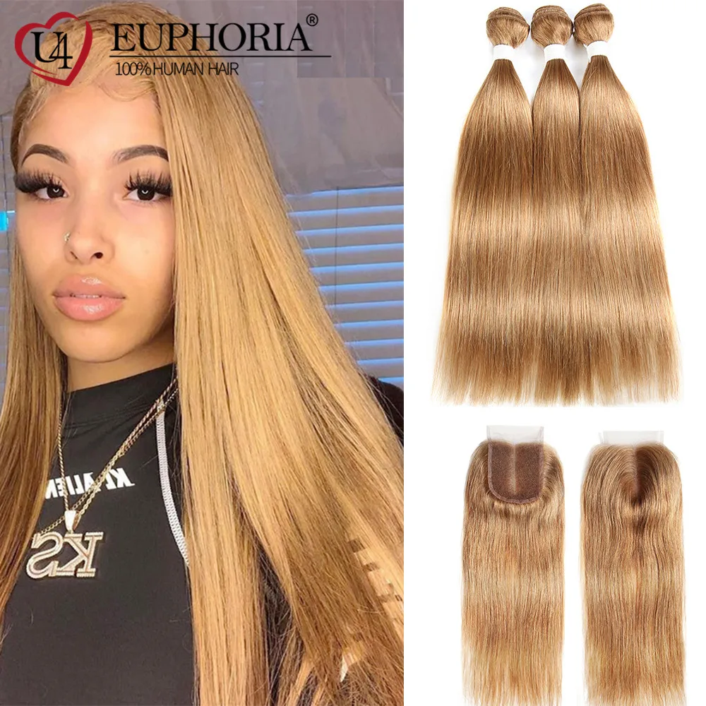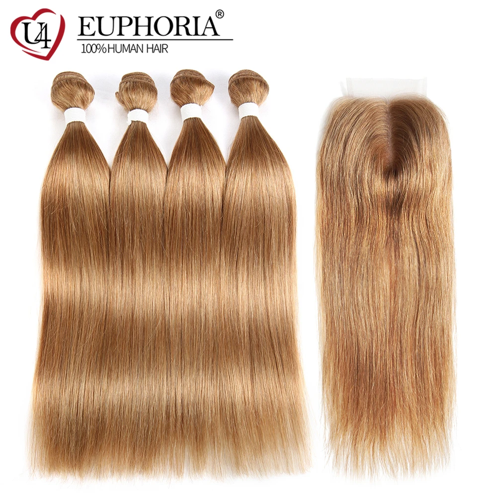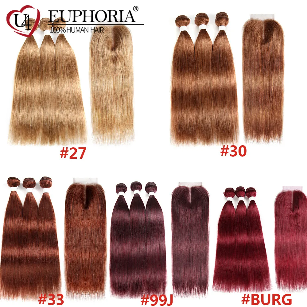 Прямые пряди волос с закрытием 4x4 блонд 27 красный Бург бразильские Remy человеческие волосы 34 шт пряди с кружевной застежкой Euphoria
