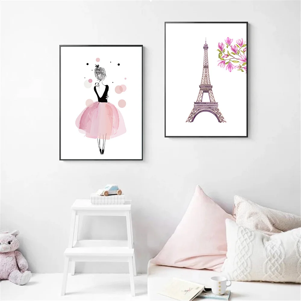 Картина на холсте с изображением балерины, девочки, розового цветка, настенный плакат для детской комнаты, декоративная картина в скандинавском стиле, декор детской комнаты