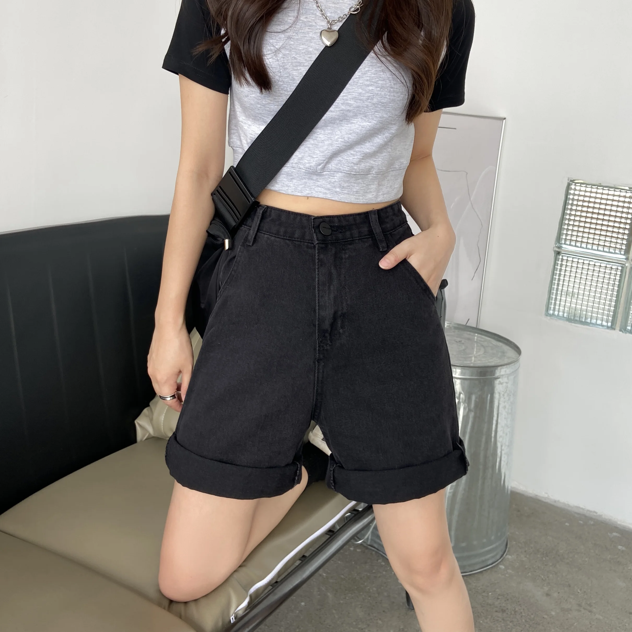 Fitaylor, новинка 2022, летние женские черные джинсовые шорты с высокой талией и широкими штанинами, повседневные женские свободные прямые джинсовые шорты на пуговицах, бермуды