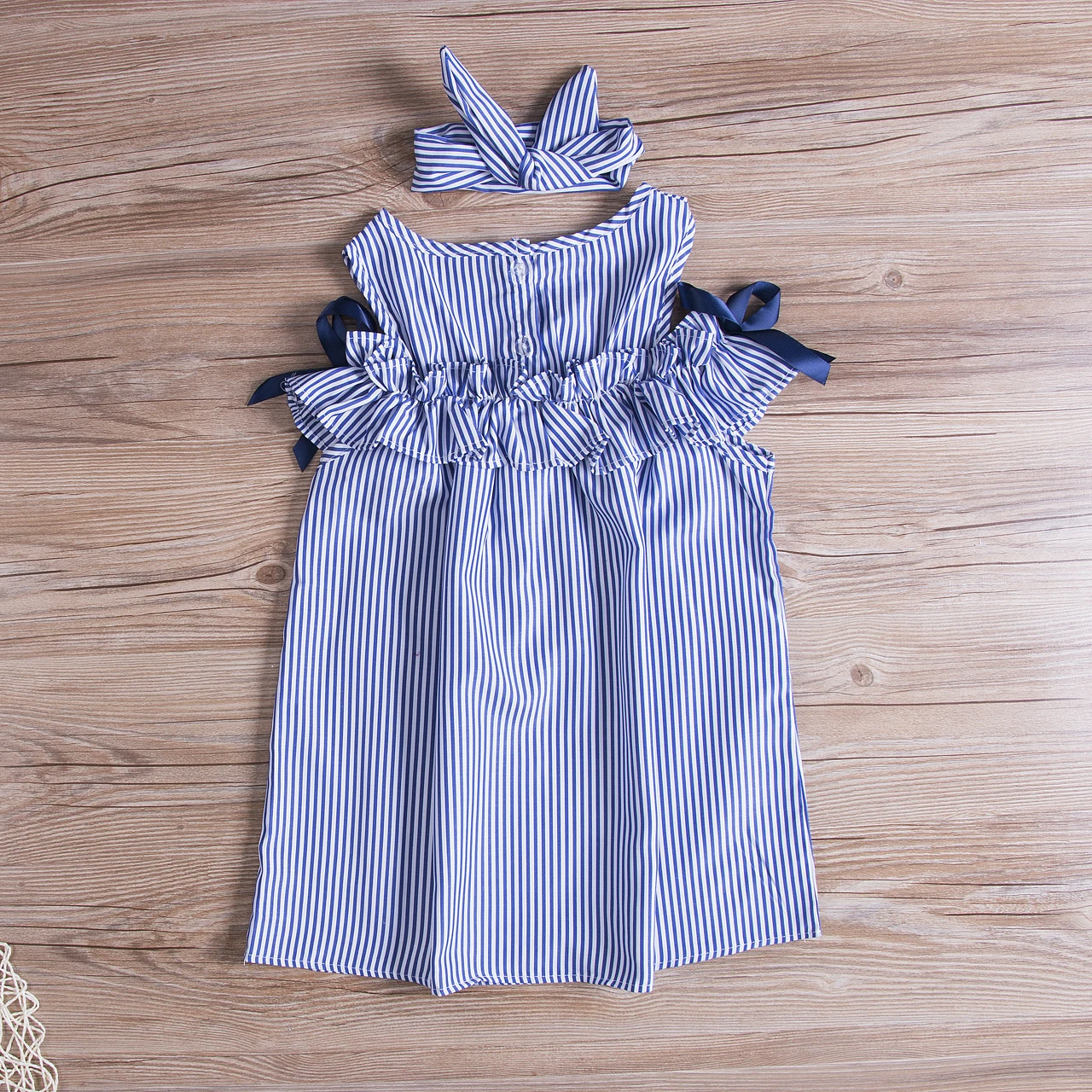 Оптовая продажа; Летняя одежда для маленьких девочек; Детская одежда синего цвета в полоску с открытыми плечами и оборками вечерние платья платье для досуга покроя Принцесса + повязка на голову