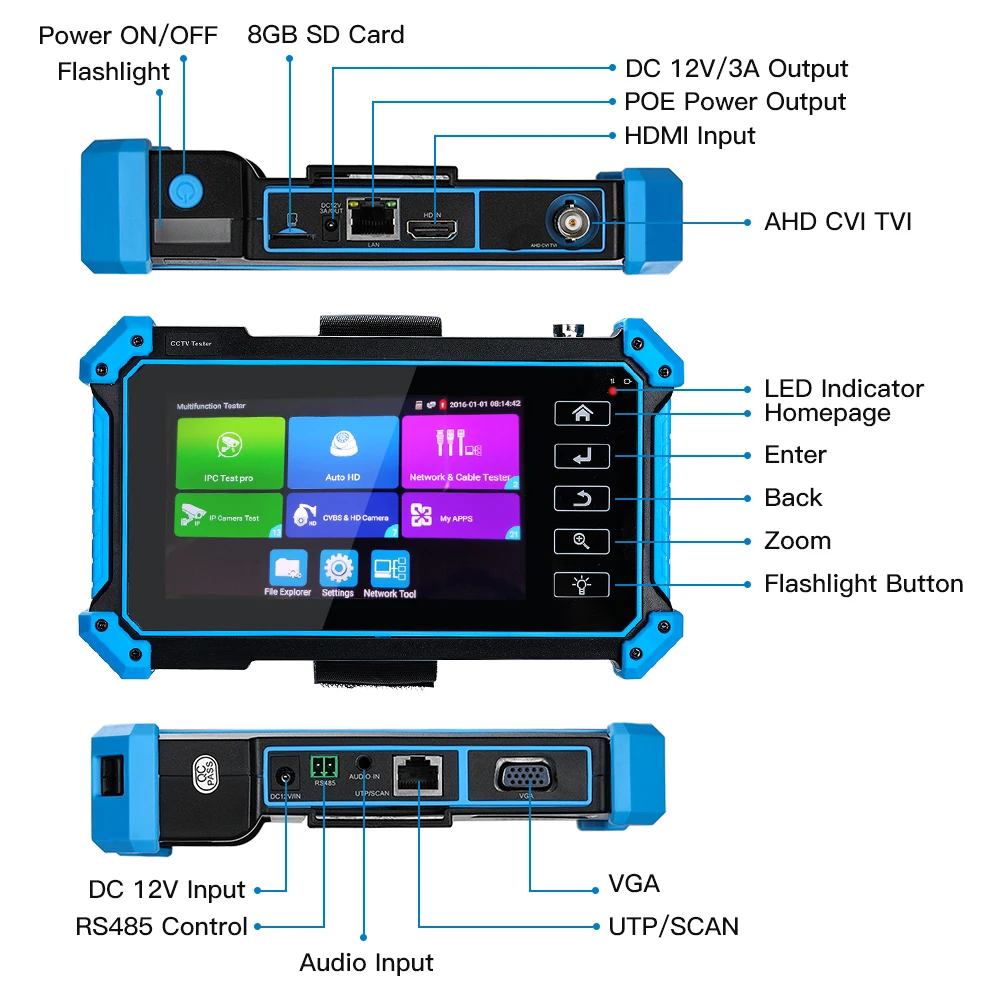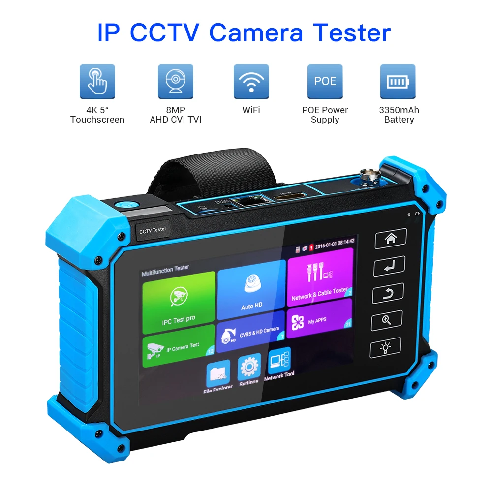 5-дюймовый IPS сенсорный экран IP-камера тестер предназначен для обслуживания и установки IP аналоговых, HD коаксиальных камер, а также другого оборудования безопасности. Разрешение 1920*1080 позволяет ему отображать сетевые HD-камеры и аналоговые камеры в высоком разрешении. Устройство поддерживает множество функций ONVIF PTZ и аналогового управления PTZ, а также тестирования кабеля. Монтажникам систем видеонаблюдения часто приходится носить с собой различные испытательные инструменты, чтобы завершить свою работу. Если взять тестер для камеры «все в одном», что делает условия работы более безопасными и повышает производительность.Особенности: