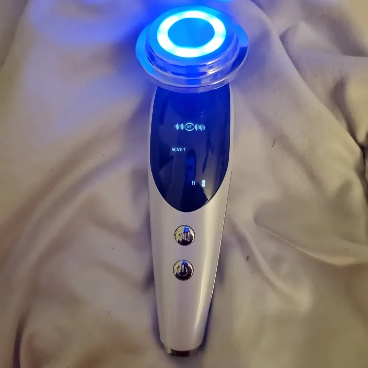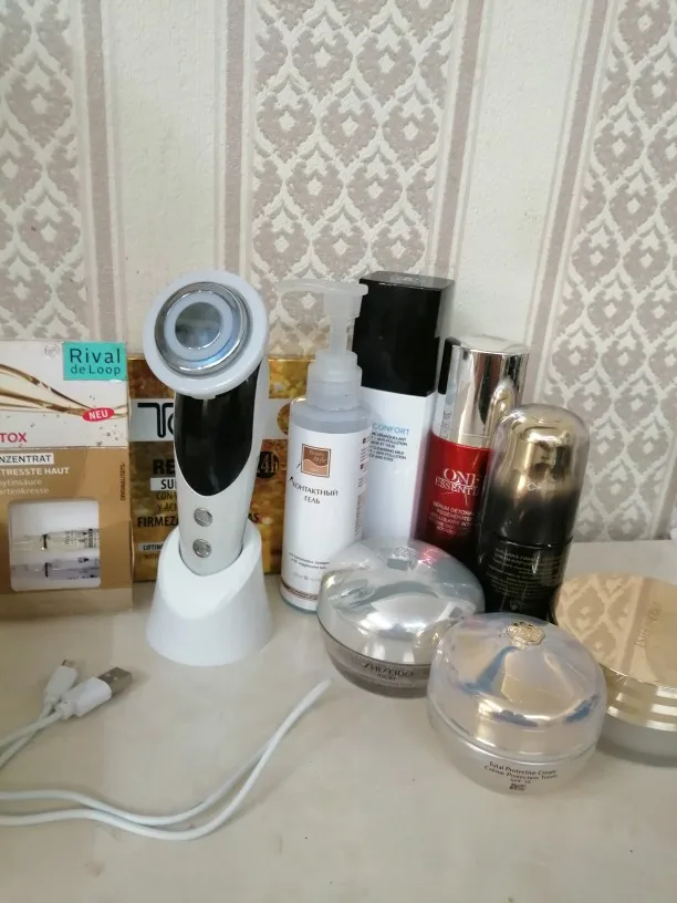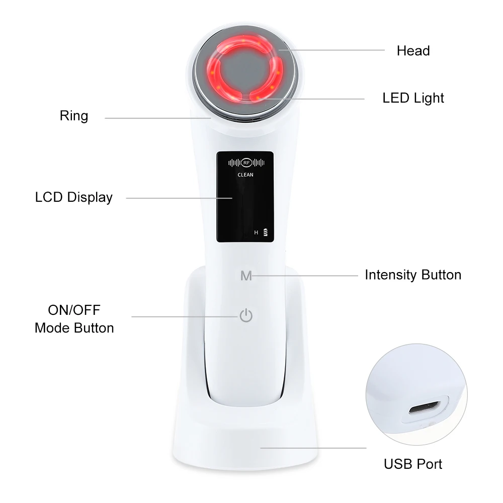 Это прибор для красоты лица с EMS микро-током (гальванические ионы), вибрациями теплого массажа, красным, синим и оранжевым светом, который может осуществить глубокое очищение, лучшее омоложение и лифтинг лица.