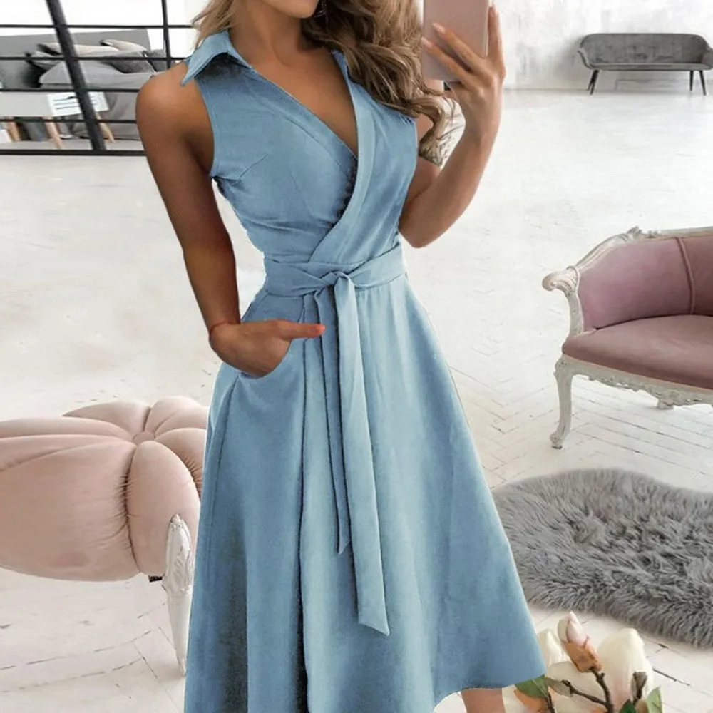 Office Lady Elegant Summer Sleeveless Dress Women Casual Turn-Down ...
