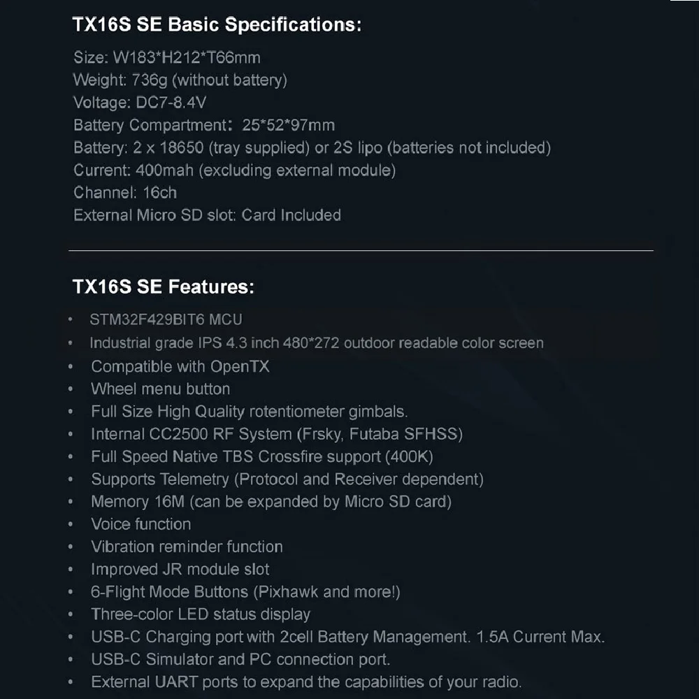 Почему стоит выбрать TX16S SE?Встроенная USB-C зарядка.USB-C порт передачи данных/симулятора.Больший отсек для батареек.Внешний слот для SD-карты.2 порта UART для обновления и самостоятельной сборки.Улучшенная навигация меню со страницей назад и вперед.Улучшенный дизайн чехла с улучшенной эргономикой захвата.Лучшее качество переключателей и дизайн размещения.Лучшие слайдеры с хорошей центриотзывы Ю.Официальная поддержка OpenTX.Официальная поддержка нескольких модулей.Улучшенная схема динамика (без шума).В комплекте коробка для переноски EPP.