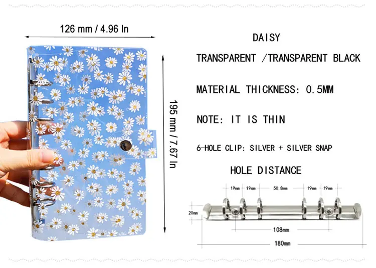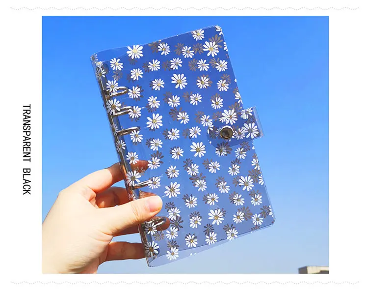 Название: Прозрачная Обложка блокнота с маргариткой A6 Материал крышки: ПВХ Размер крышки: 126*195 мм/4,96*7,67 дюйма Посылка входит: 1 * чехол для ноутбука Цвет: прозрачный, прозрачный черный, прозрачный розовый