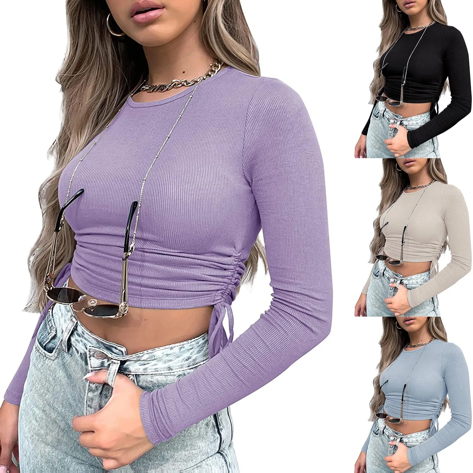 Женская футболка, милые укороченные топы, однотонные облегающие Женские топы с длинным рукавом и кулиской, рубашки, футболки с рюшами, облегающий Топ, уличная одежда