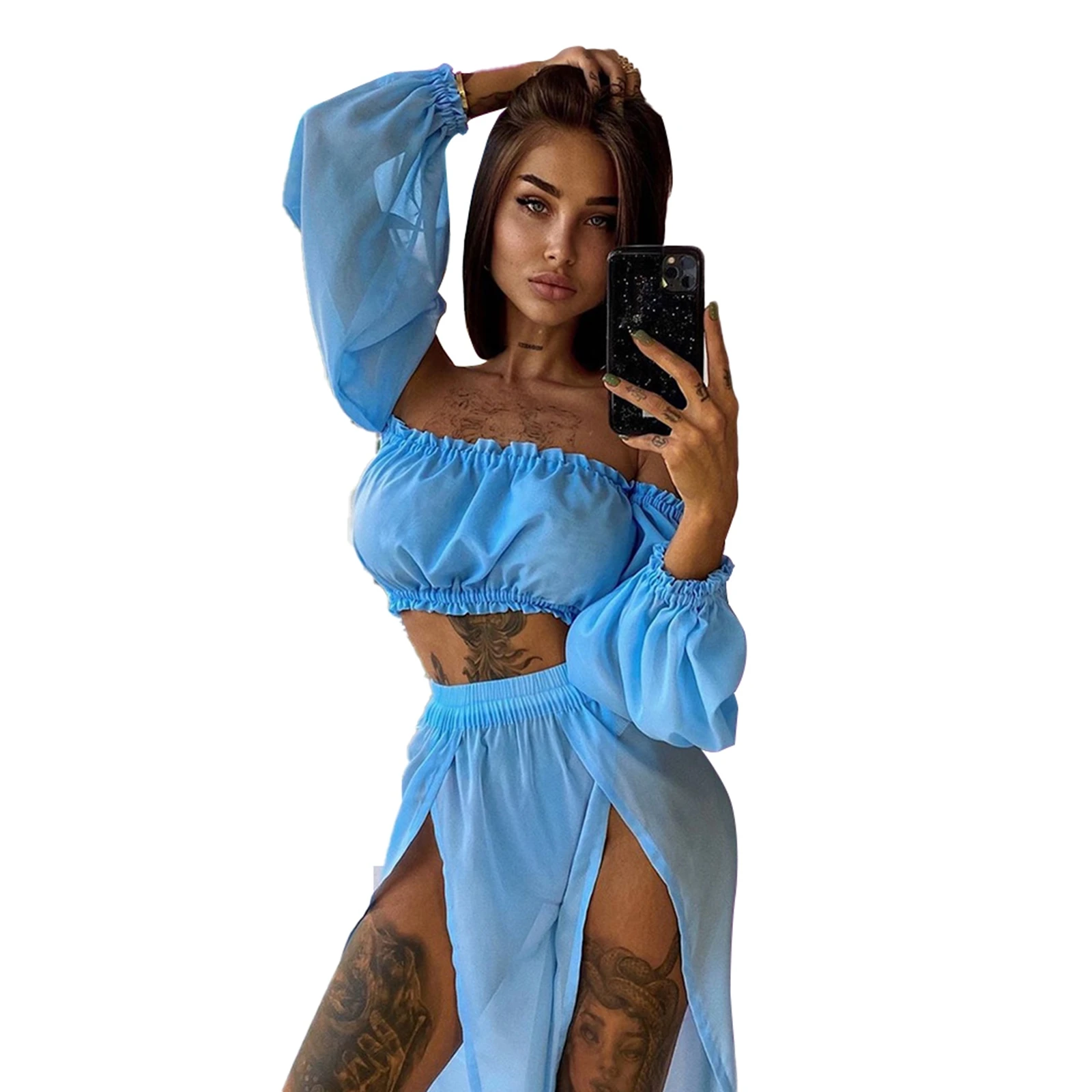 Женский костюм-двойка, Топ с длинным рукавом и открытыми плечами и юбка, для пляжа и путешествий, 2021