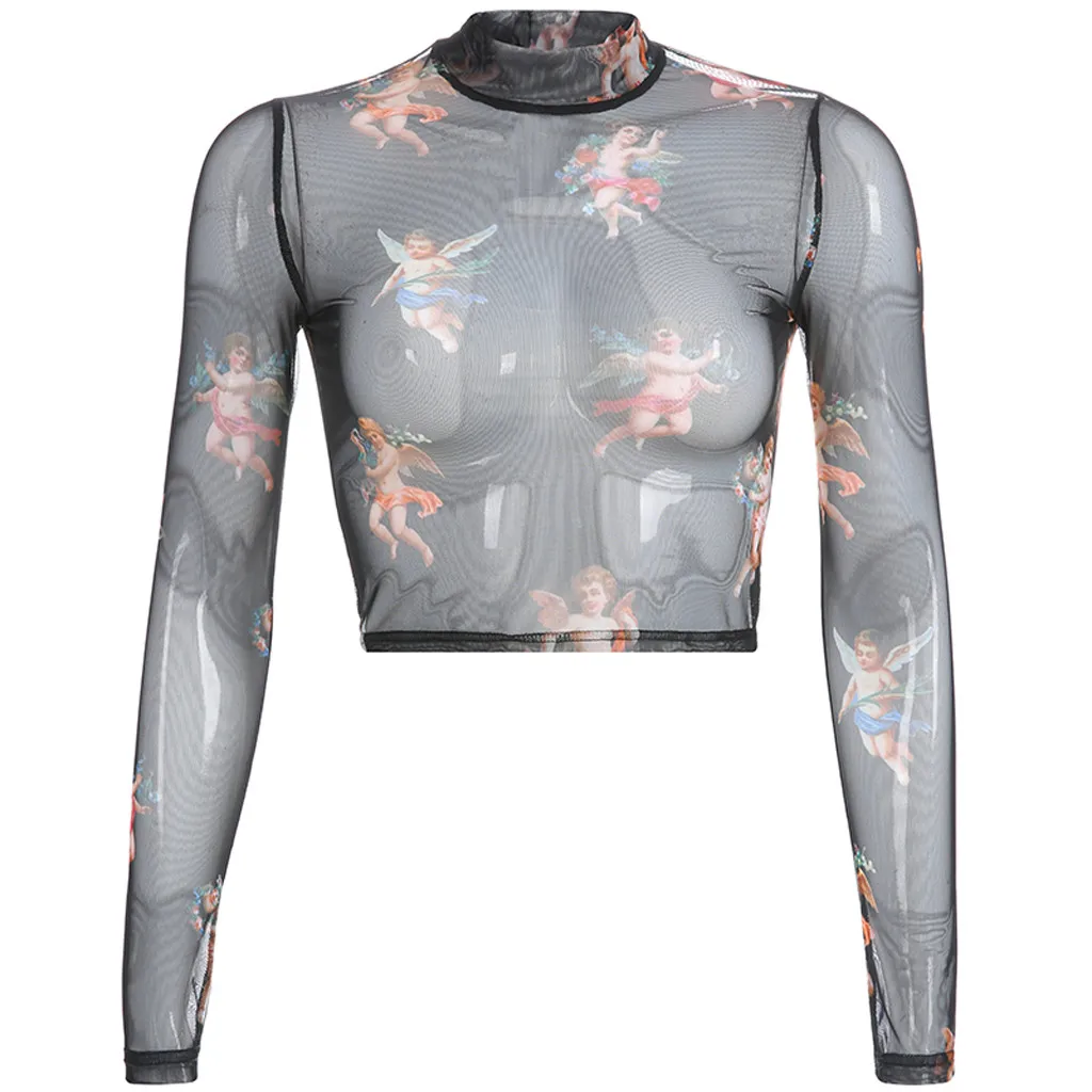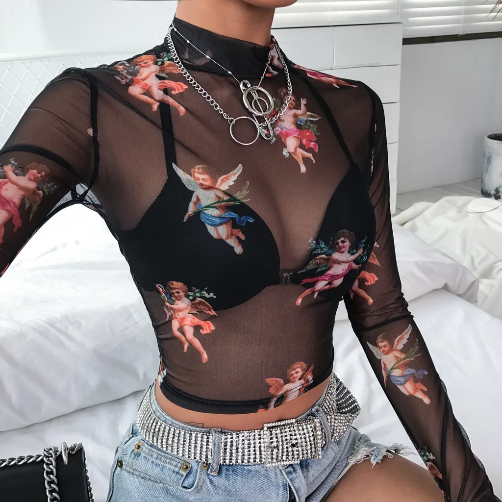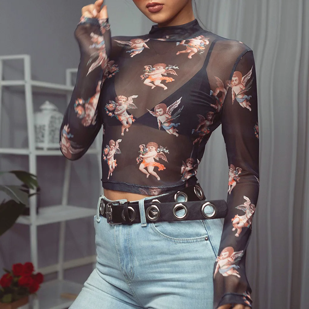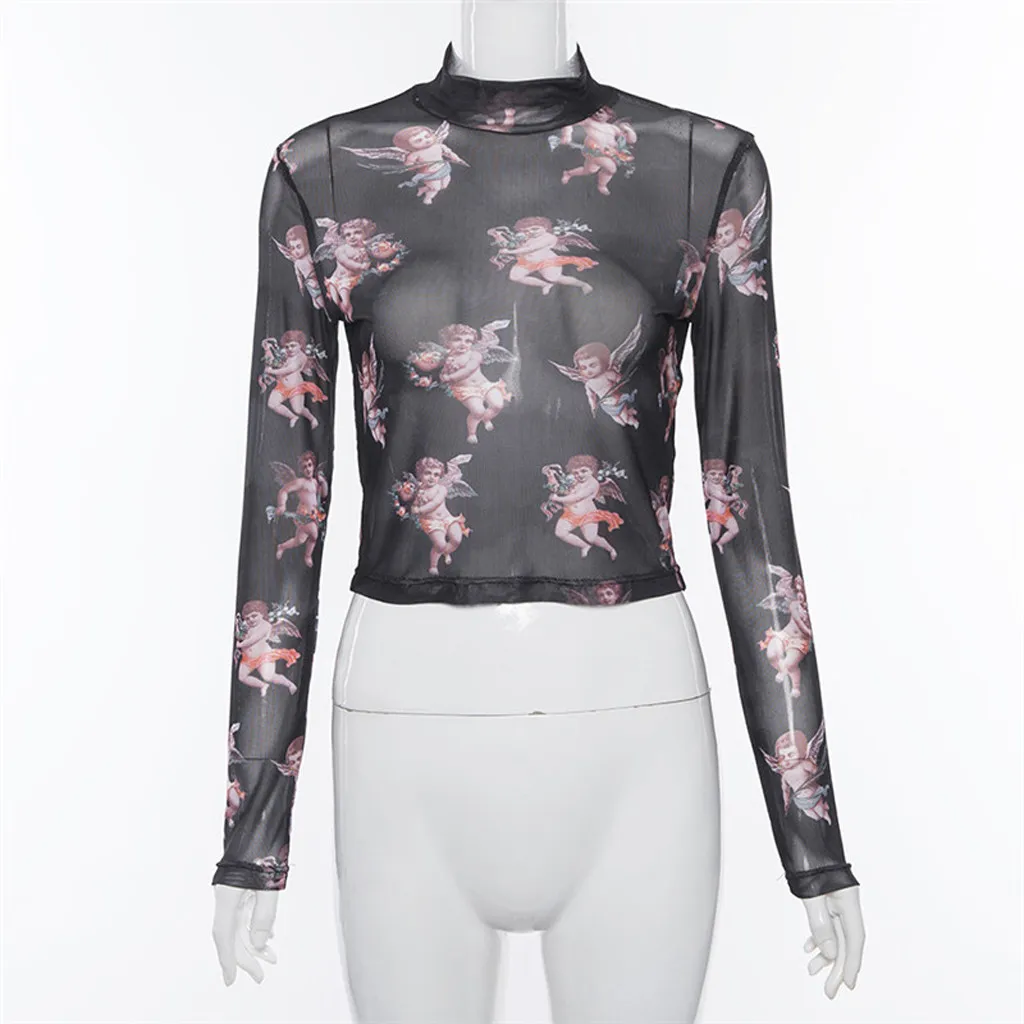 Женская ажурная Сетчатая футболка, уличная одежда, топ с высоким воротником, летняя футболка с длинным рукавом и забавным принтом ангела Купидона # T5P
