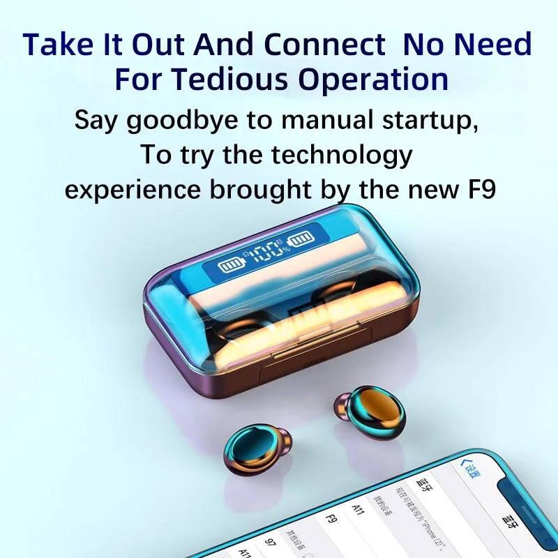Услышь по новому! TWS F9 беспроводные Bluetooth-наушники очень практичны, полностью беспроводные, благодаря чему предоставляют пользователю полную свободу движений. Любителям качественного звука придет по душе объёмный и очень качественный звук по новой, усовершенствованной технологии, 8D HI-FI surround Stereo sound. Дополнительным преимуществом является опция шумоподавления, которая позволяет получить еще более лучшее качество звука. Стильный внешний вид и комфорт заставят вас остаться с ними. Универсальный чехол 3in1. с функцией Powerbank-спасет вас в непредвиденной ситуации, когда нужно остаться на связи. Когда наушники разряжаются, нам нужно положить их в чехол (мы можем зарядить наушники 4 раза на 100% заряженном корпусе). После открытия чехол также можно использовать в качестве подставки для телефона. LED дисплей покажет заряд наушников и самого кейса, чтобы выходя из дома вы точно знали-На сколько Вам хватит зарядки!