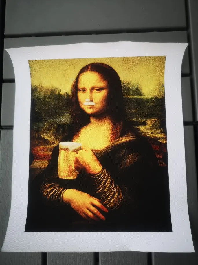 Картина была взята за монеты+0.01$, отслеживалась, пришла за 1 месяц. Полностью соответствует фото продавца, размер 20*25 см + по 3 см белого по краям, качество очень хорошее, плотное. Картинка яркая, качественная, прикольная Мона Лиза с пивом))) Рекомендую