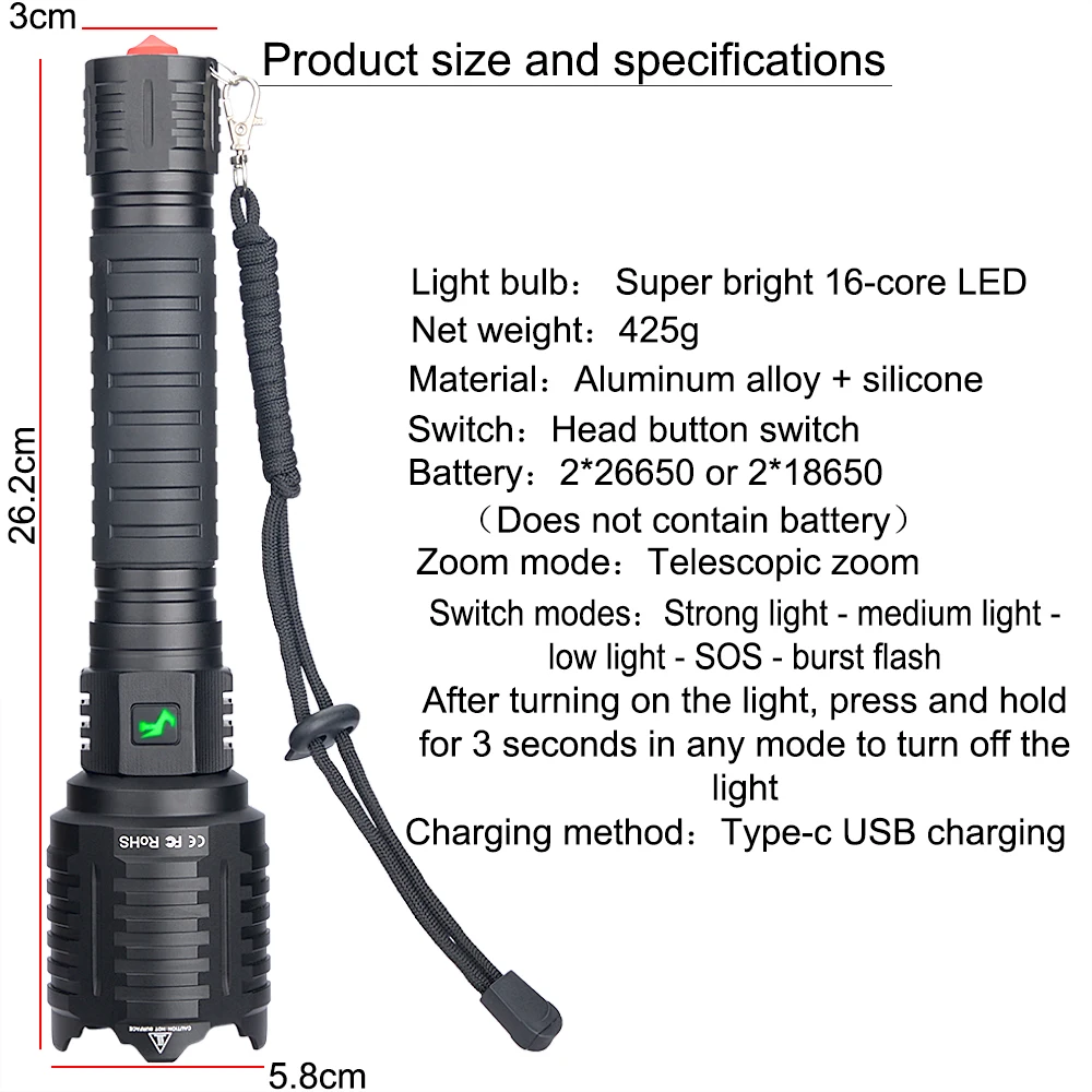 Особенности: Супер яркий: с использованием высококачественного чипа xhp160 дальность освещения может достигать 25 квадратных метров, так что функция этого фонарика не только удаленное освещение, также может использоваться в качестве прожектора.