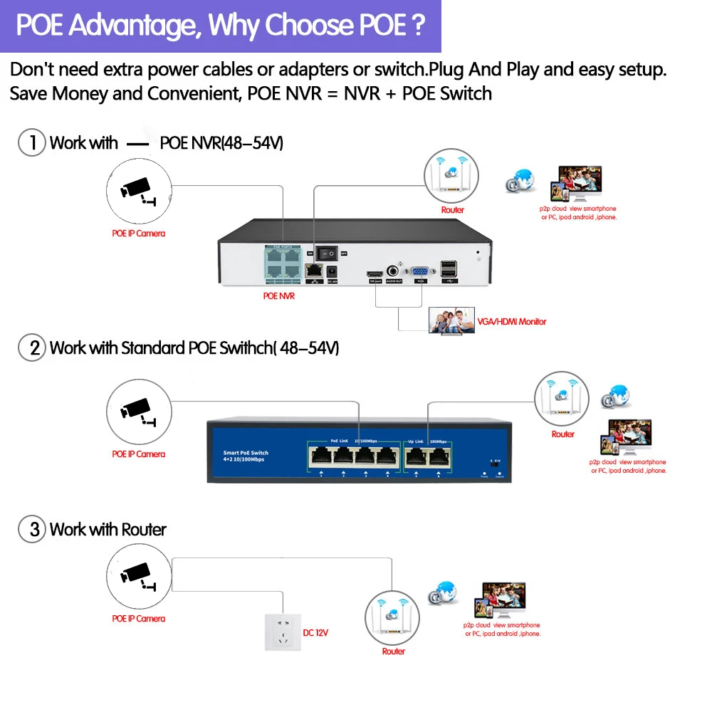 Простая настройка, всего 4 шага для просмотра на мобильный телефон,Просмотр видео в режиме реального времени в системе из любого места и в любое время с помощью смартфона, стола или ПК с передовой технологией P2P, вы можете получить удаленный доступ к вашей системе в течение нескольких минут или меньше, нет необходимости в переадресации, удаленный доступ никогда не был таким простым!