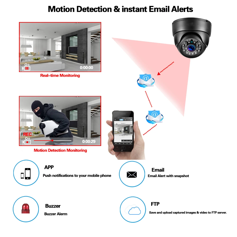 Эта система предназначена для отправки оповещения по электронной почте при обнаружении любого движения и позволяет записывать только при обнаружении движения.Можно настроить область, которую вы хотите контролировать, когда она срабатывает, она отправит сообщение на вашу электронную почту, вы можете получить информацию из первых рук, независимо от того, когда и где вы находитесь.