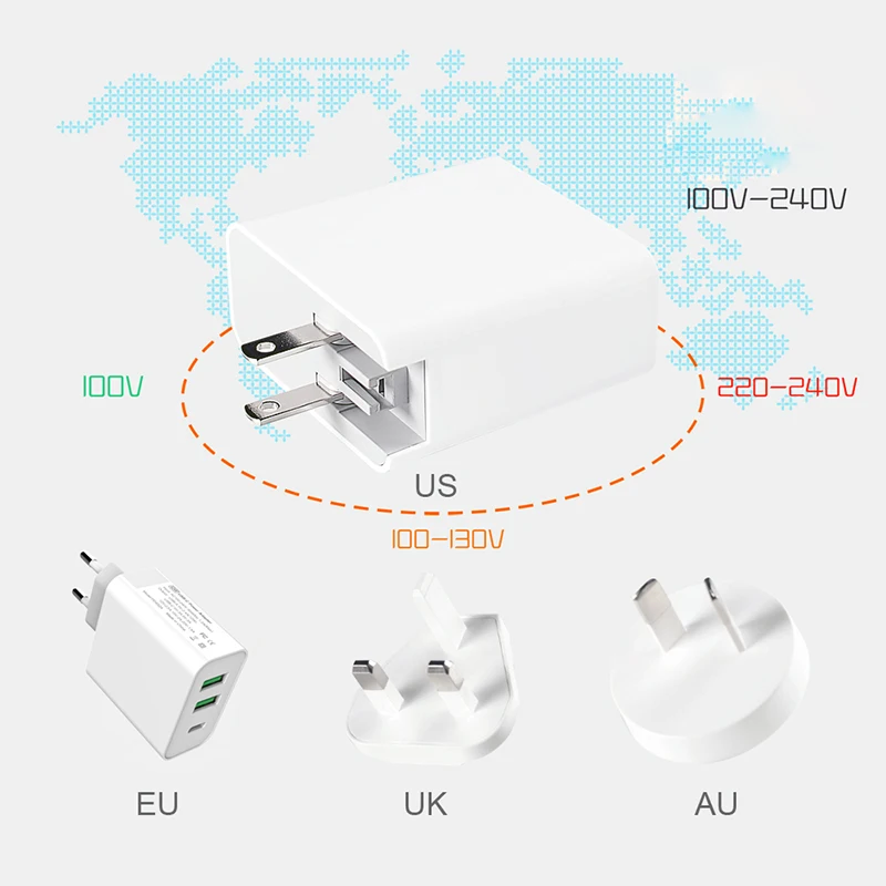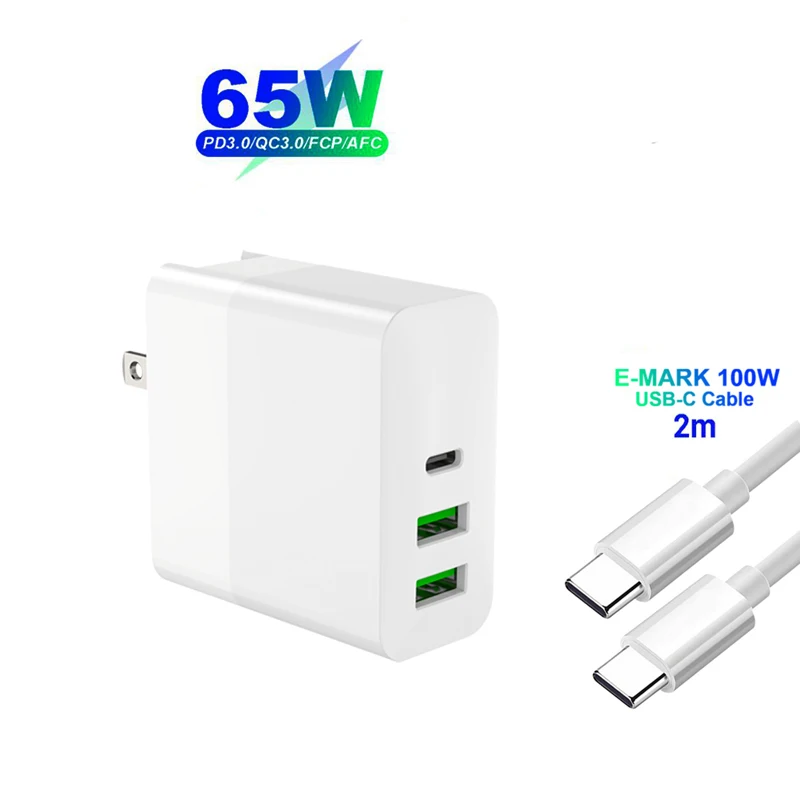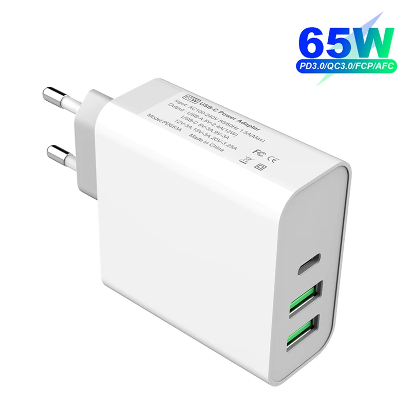 3 порта 65 Вт USB-C PD быстрый адаптер питанияОдин порт поддерживает быстрое зарядное устройство 65 Вт (макс.)Выход USB-C:DC 5V/3A,9V/3A,12V/3A,15V/3A,20V/3.25A (макс.: 65W)USB 1/2 Выход:5 В/2,4 А постоянного тока (макс.: 12 Вт)Два порта поддерживают 62 Вт (макс.) при одновременной зарядкеВыход USB-C: 65 Вт МаксUSB-C + A1 выход: 45 Вт + 12 Вт (57 Вт)USB-C + A2 выход: 45 Вт + 12 Вт (57 Вт)USB-C + A1 + A2 выход: 45 Вт + 9 Вт + 9 Вт (63 Вт)