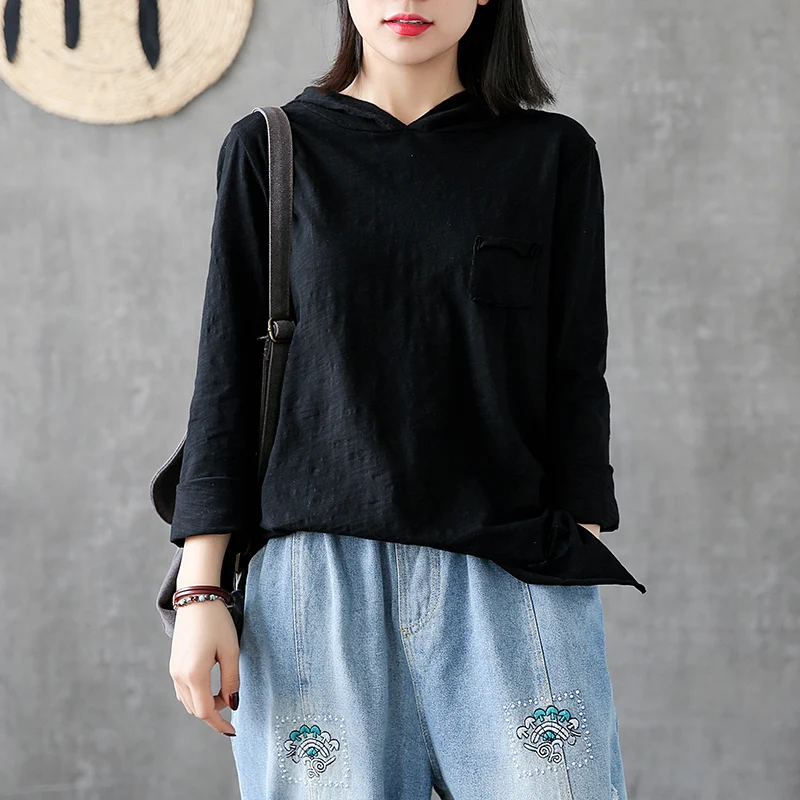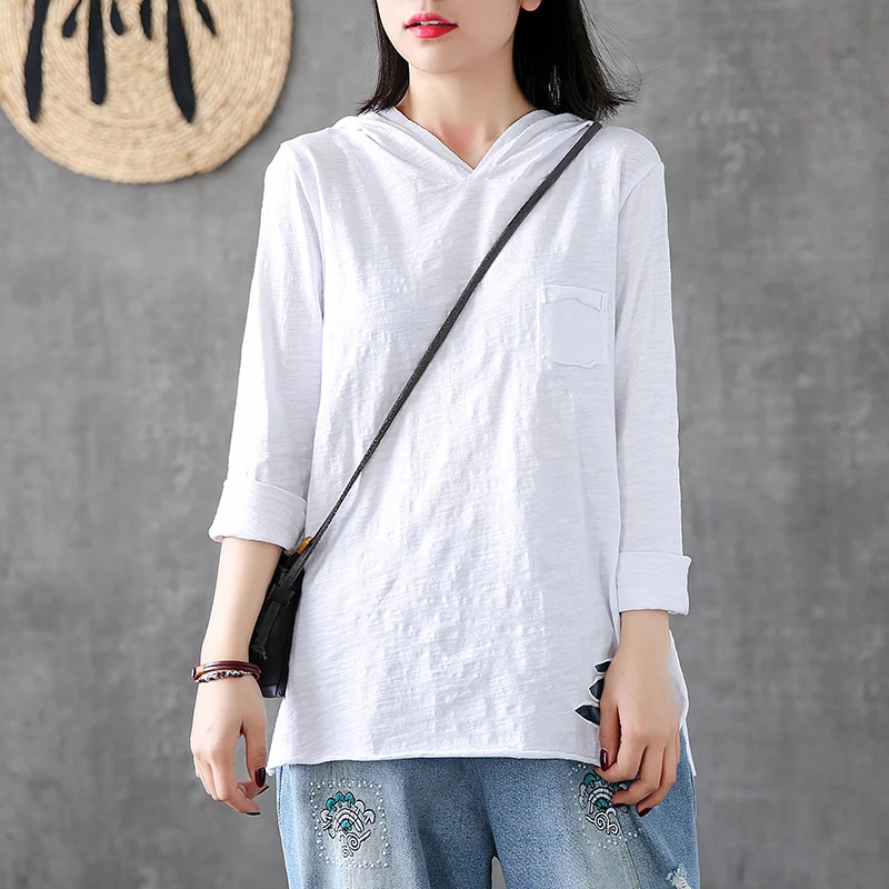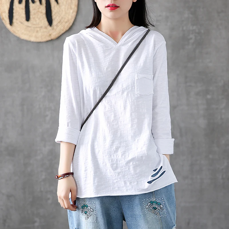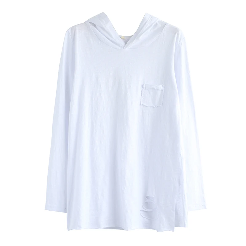 Белая футболка с капюшоном для женщин 100% натуральный хлопок свободного покроя отверстие свободные с длинным рукавом женские летние топы 2020 новый стиль