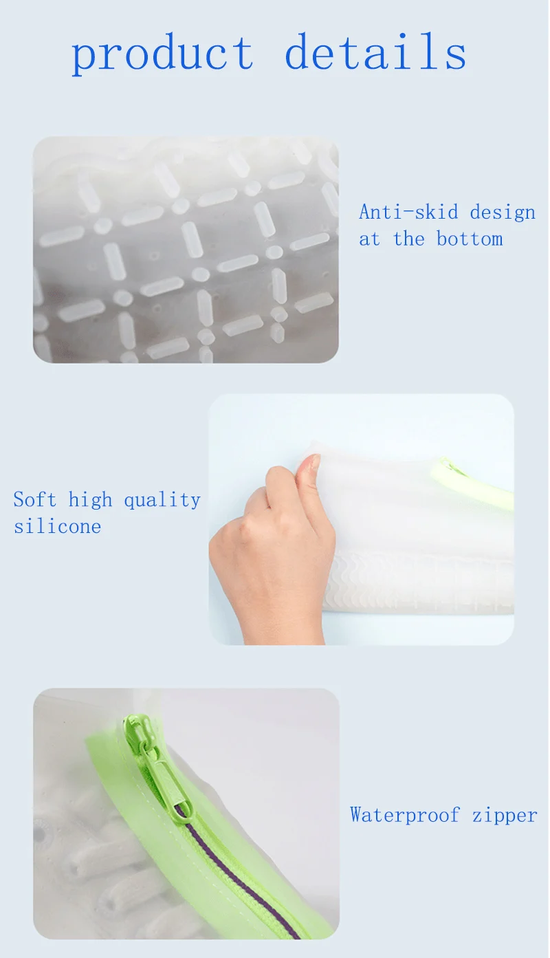 [Материал]: силикагель[Размер сумки]: XL (25*15) L M S (24*14) в см [вес крышки обуви]: Увеличение: 252 г/большой: 189 г/м: 149 г/Малый: 109 г[Цвет]: доступно 6 цветов s, другие цвета s могут быть настроены[Характеристики]: 1. Водонепроницаемость: его можно использовать непосредственно на поверхности воды и не использовать под лодыжку. 2. Противоскользящие: Нескользящие линии снизу. 3. Легко чистить: протрите полотенцем или щеткой после ношения. 4. Подходящие случаи: дождливая погода, ходьба в дикой природе, пляж