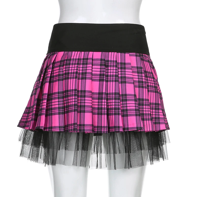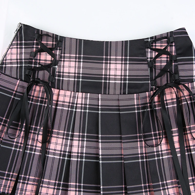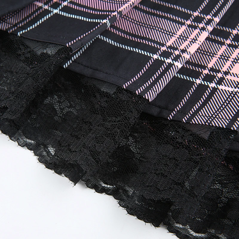 Женская юбка со шнуровкой Goth Y2K, розовая клетчатая плиссированная юбка в полоску с кружевной отделкой, в стиле панк, темная академия, эстетическая одежда для девушек