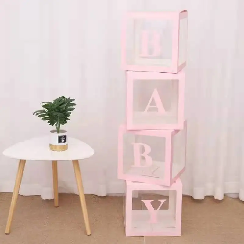 4 прозрачные коробки для воздушных шаров, 4 буквы «B», «A», «B», «Y», «L», «O», «V», наклейки "E". Вы можете поместить другие украшения в уникальные вечерние коробки, за исключением латексных шаров. Добавьте прекрасные украшения для детского душа в эти красивые коробки.