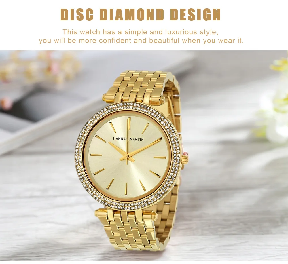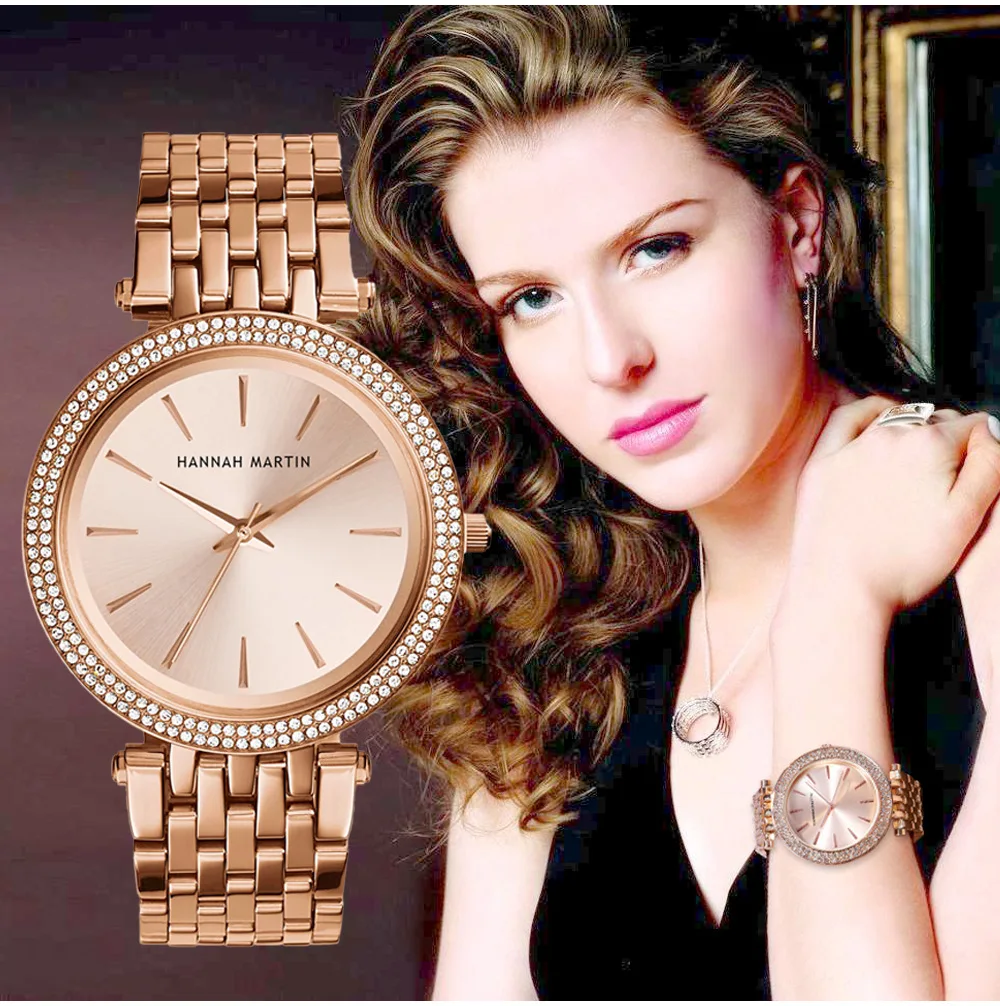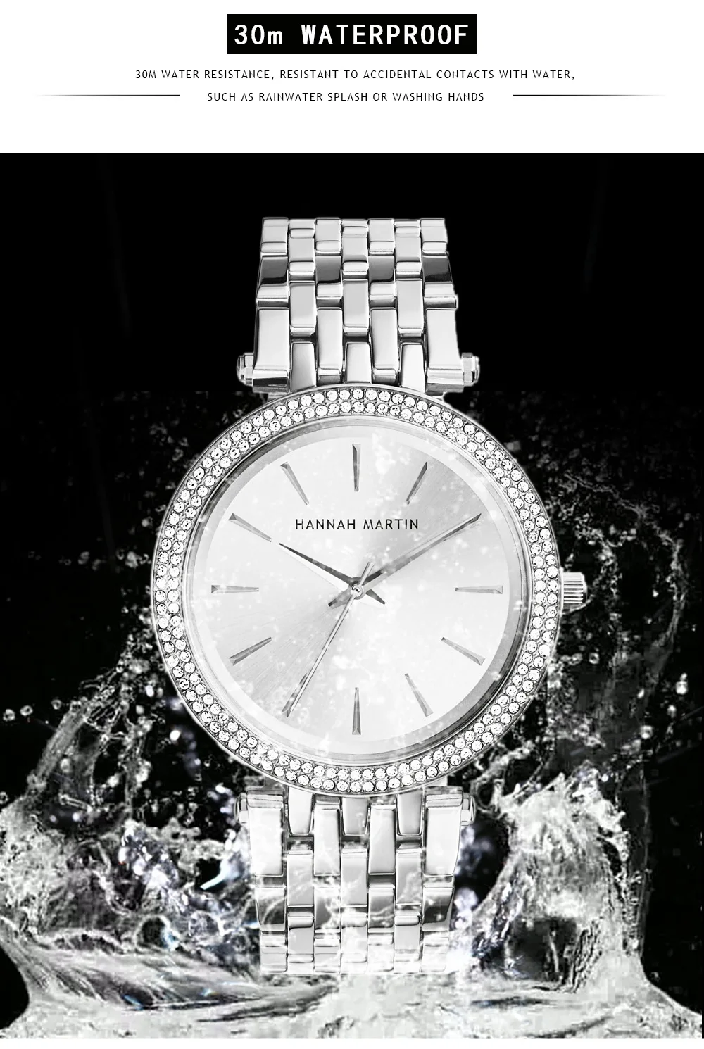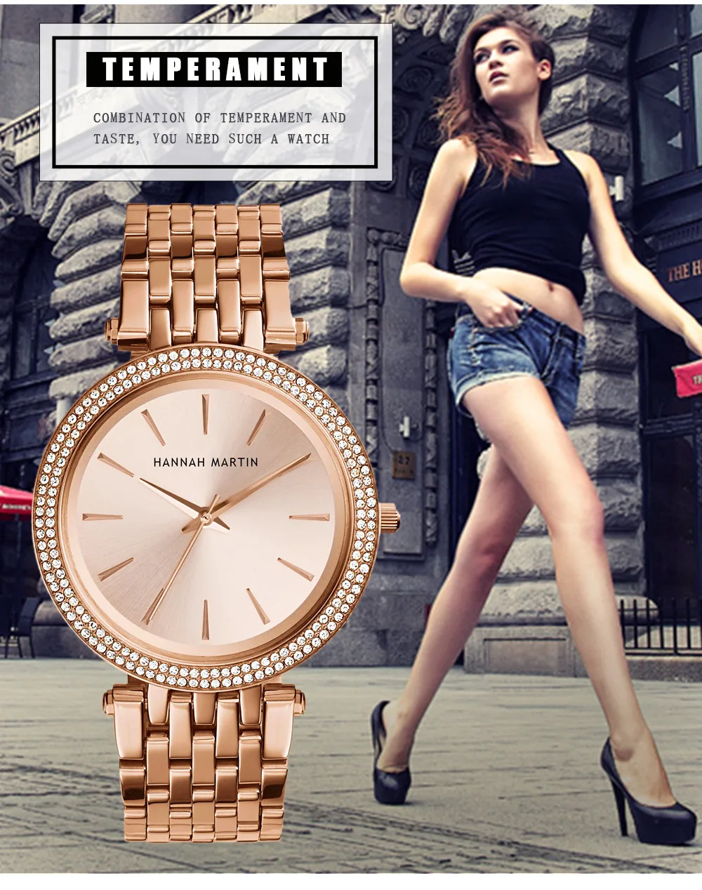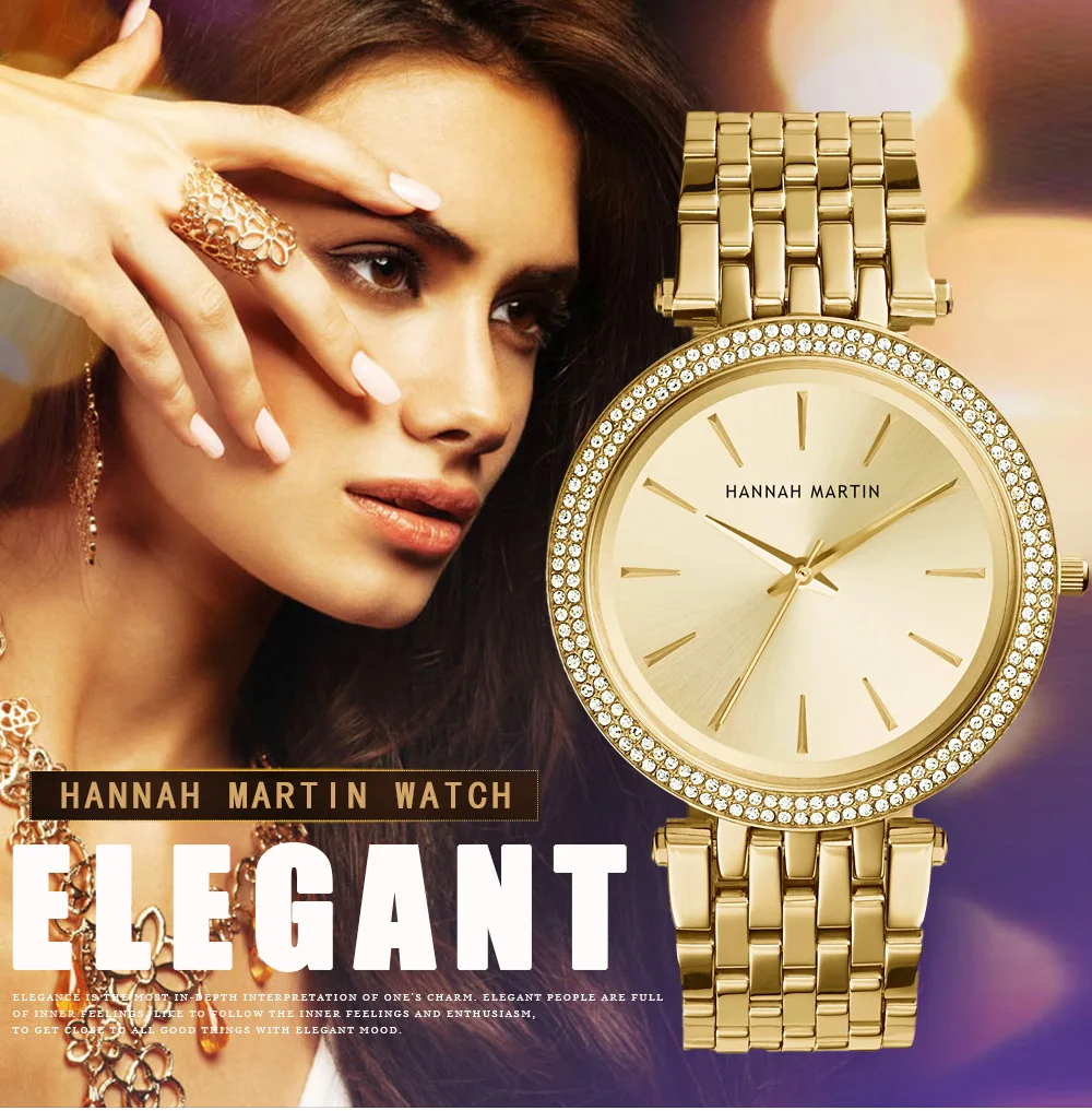 Лидер продаж, высококачественные золотые часы Hannah Martin с бриллиантовой рамкой, женские модные кварцевые наручные часы с инкрустацией бриллиантами