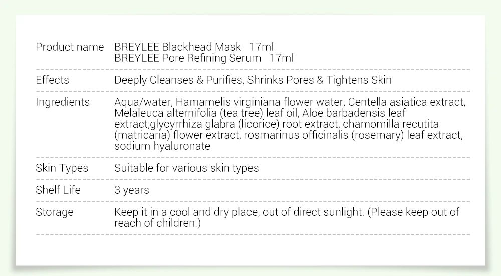 Название продукта: BREYLEE черная маска 17 мл BREYLEE Сыворотка для рафинирования пор 17 мл Эффекты Глубоко очищает и очищает, сужает поры и подтягивает кожу Ингредиенты Aqua/water, Hamamelis virginiana flower water, экстракт Centella asiatica, Melaleuca alternifolia (чайное дерево) масло листьев, экстракт листьев алоэ barbadensis, глицирхиза глабра (лакрица) экстракт корня, chamomreilla cutiilla экстракт цветка, экстракт листьев rosmarinus officinalis (розмарина), гиалуронат натрия Типы кожи: подходит для различных типов кожи Срок годности: 3 года Хранение: держите его в прохладном и сухом месте, вне прямых солнечных лучей. (Пожалуйста, держите в недоступном для детей месте.)