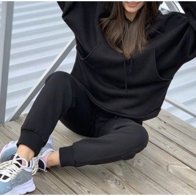 Женский спортивный костюм из 2 предметов, Повседневный пуловер с капюшоном и длинные штаны, теплый спортивный костюм для отдыха, Осень-зима