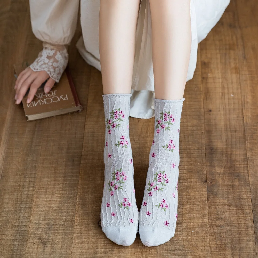Носки женские, в стиле Харадзюку, с оборками и цветочной вышивкой