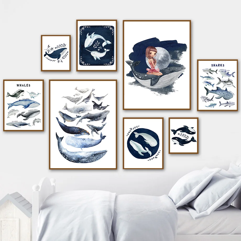 Настенная картина с морскими животными, голубыми китами, акулой, Ос...