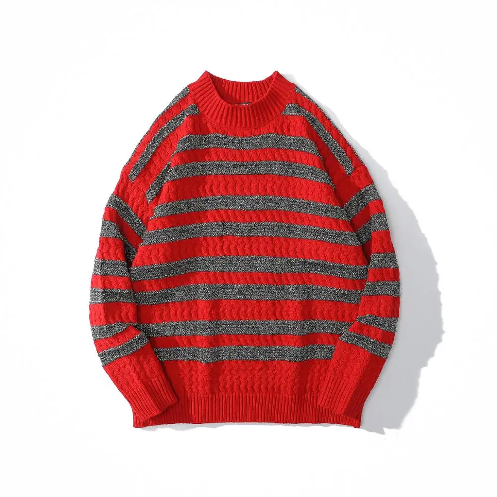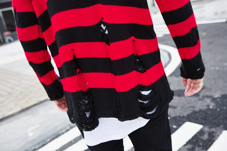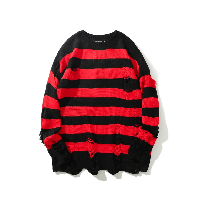 Свитер в полоску для мужчин и женщин, вязаный джемпер оверсайз с потертостями, с дырками, черного и красного цвета, в стиле Харадзюку, 2021