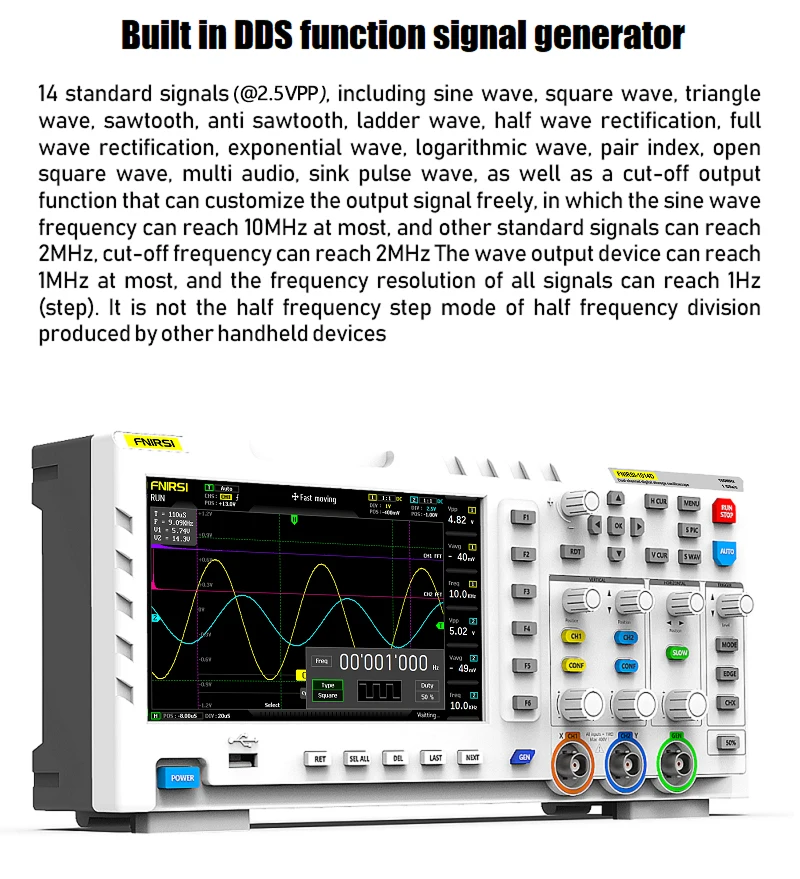 FNIRSI-1014D-это два в одном осциллографе и генератор сигналов, запущенный FNIRSI. Он имеет комплексные функции и высокую практичность. Это экономичный двухканальный Настольный осциллограф для индустрии технического обслуживания и НИОКР. Осциллограф имеет частоту дискретизации в реальном времени 1GSa / s и аналоговую пропускную способность 100 МГц * 2; Полная функция триггера (однократное/нормальное/автоматическое), как для периодического аналогового сигнала, так и для aperiodic цифрового сигнала может быть использован свободно; Встроенный генератор сигналов DDS и оригинальный выходной сигнал в отрасли (@ 2.5vpp), Все шаги частоты сигнала-1 Гц, поддержка 14 видов стандартного функционального сигнала и настраиваемого сигнала, измельчение выходного устройства захватывает часть или всю часть сложных сигналов, измеренных осциллографом как выходной сигнал генератора сигнала, который может хранить до 1000 индивидуальных сигналов отключения; Встроенный модуль защиты от высокого напряжения может выдерживать Непрерывное напряжение до 400 В, не беспокоясь о ДТП при сжигании осциллографа, вызванном тем, что датчик не перемещается на 10x шестерню. Большой режим горизонтальной прокрутки, который может контролировать медленные изменения уровня; Оснащен эффективной одной кнопкой авто, которая может отображать измеренную форму волны без утомительной регулировки; дисплей высокой четкости ЖК-дисплей с 7-дюймовым 800*480 разрешение; Курсором благодаря функции измерения, при ручном чтения амплитуду и частоту параметры, Не нужно считывать фоновые весы и количество, и не нужно конвертировать, чтобы напрямую Получить пик до пика и частоты, чрезвычайно удобная функция захвата экрана и хранения сигналов, встроенная память объемом 1 Гб, может хранить до 1000 фотографий с экрана + 1000 групп данных волноводной формы, Процесс хранения прост и быстр, сохранение текущей формы сигнала одним щелчком, отсутствие громоздких подсказок и выбор для сохранения текущих данных, очень удобный; Мощный менеджер изображений формы волны, поддержка просмотра эскизов, просмотр, просмотр подробной информации о функциях поворота страницы, удаления и увеличения формы волны, Уменьшение и перемещение удобны для вторичного анализа. Фюзеляж оснащен интерфейсом USB, который может быть подключен к компьютеру для реализации совместного использования собственных фотографий экрана и компьютера, что удобно для вторичного анализа; функция графического дисплея Li Shayu может использоваться для сравнения и определения амплитуды, частоты и фазы двух групп сигналов; Функция просмотра FFT может оценить гармонический компонент сигналов; Функция графического дисплея Li Shayu может использоваться для сравнения и определения амплитуды, частоты и фазы двух групп сигналов;