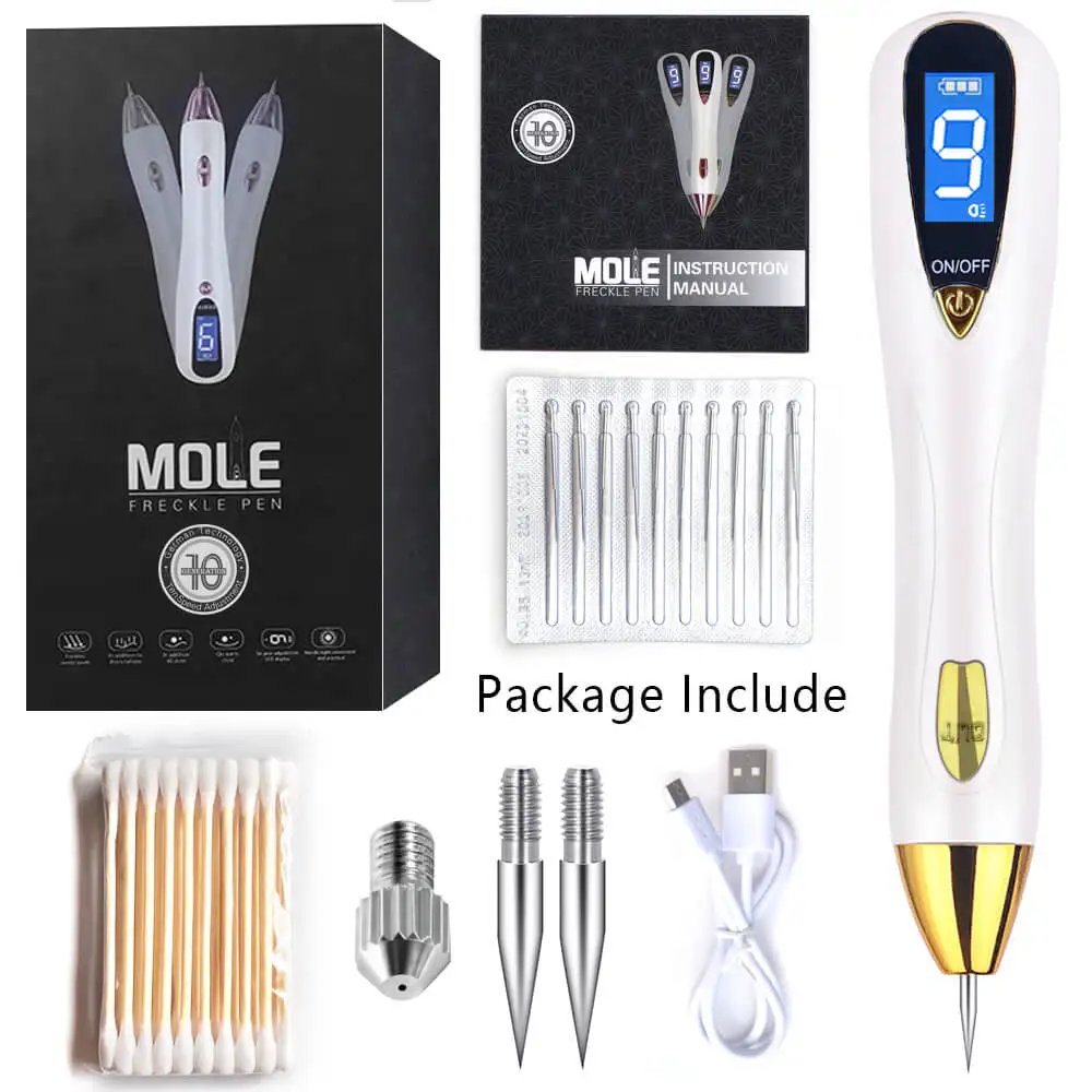 Посылка: 1 ручка прибор для удаления родинок 30 х ватных тампонов 10 тонких игл 2 x грубые иглы 1 х крышка иглы 1 x USB-кабель для зарядки 1 х Руководство пользователя Посылка вочная коробка > Со светодиодным прожектором > 9 регулируемых уровней > С ЖК-дисплеем