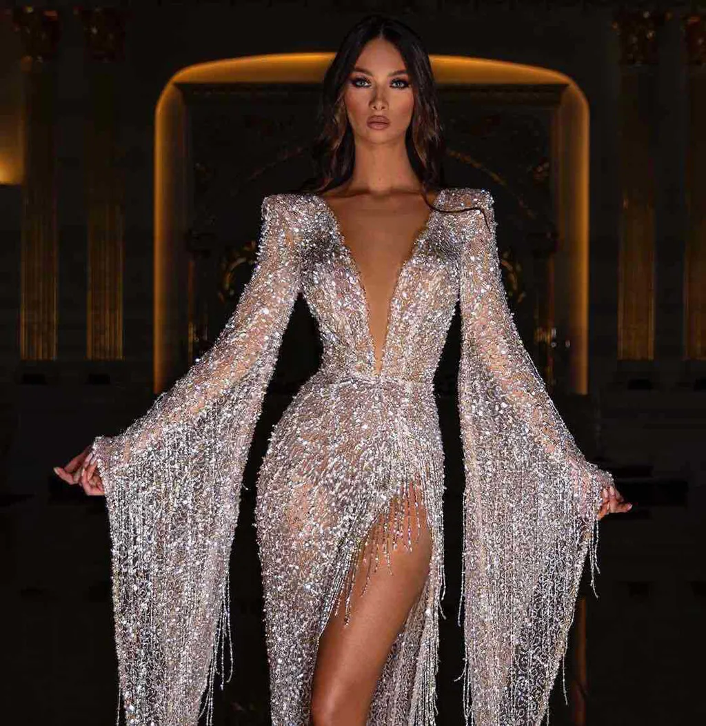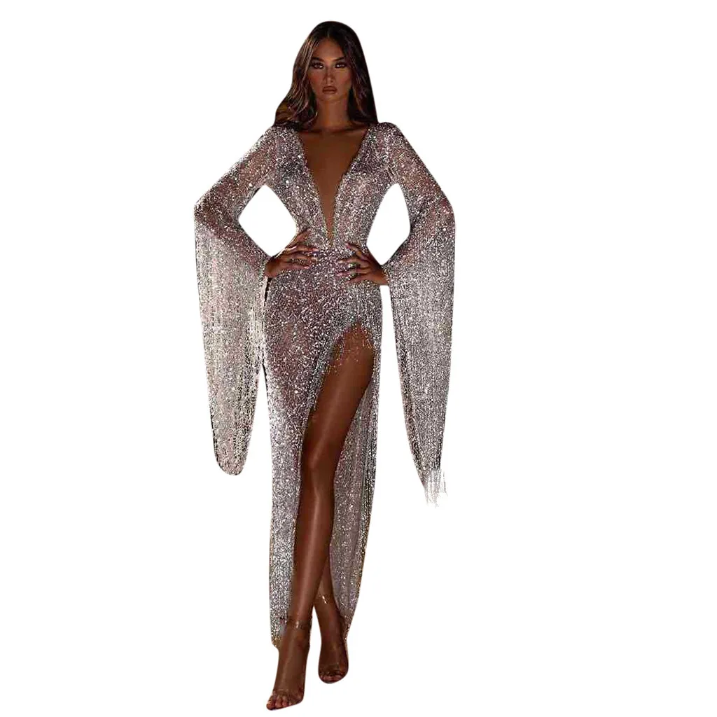 Платье женское длинное для выпускного вечера, элегантное пикантное вечернее облегающее Платье макси с блестками и кисточками, с разрезом и оборками, размера плюс